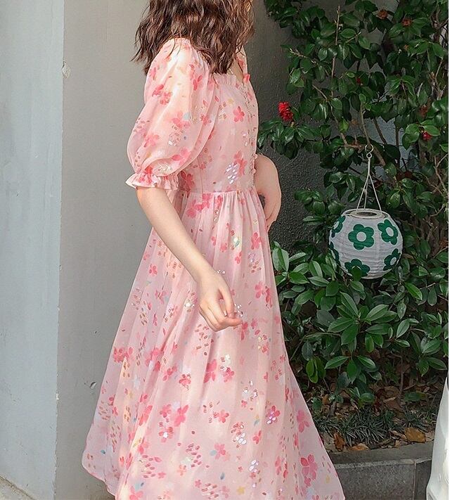 ワンピース ワンピドレス ロング ロング丈 袖あり 半袖 パフスリーブ Vネック フレア フリル かわいい 大人可愛い おしゃれ お洒落 大人可愛い 大人女子 ラブリー キュート 主役級 存在感 とろみ感 抜け感 柄 花柄 フラワー 春 夏 10代 20代 30代 レディース 女性用 デート お出かけ 韓国 韓国系 ファッション コーデ スタイル モテ インスタ映え XS S M ピンク | Raforea