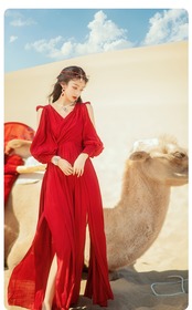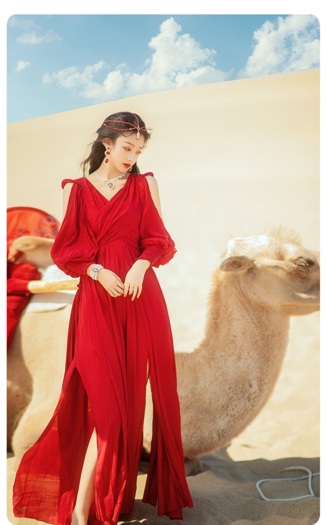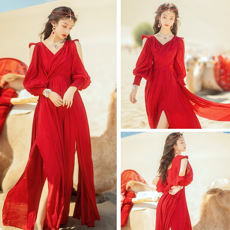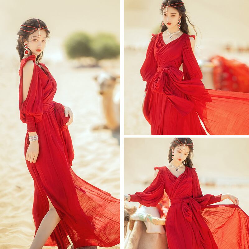 ドレス 衣装 ワンピース ステージドレス 舞台衣装 舞台ドレス ロング ロング丈 袖あり 長袖 ボリューム袖 Vネック ハイウエスト かわいい おしゃれ お洒落 アジアン エスニック エキゾチック こなれ感 個性的 セクシー 主役級 存在感 エレガント かわいい 華やか アジアン 無地 10代 20代 30代 レディース 女性用 インスタ映え シーズンレス S M L 赤 レッド | Raforea