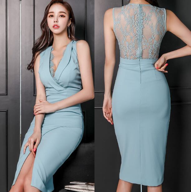 ワンピース タイトスカート ワンピドレス ミディアム丈 袖なし Vネック スリム タイト Iライン マーメイド 切り替えデザイン レース スリット バックシャン バックコンシャス 透け感 シースルー 大人可愛い 大人女子 セクシー エレガント 主役級 存在感 デート お出かけ パーティー イベント ホテル モテ 美脚 脚長 インスタ映え ブルー 水色 | Raforea