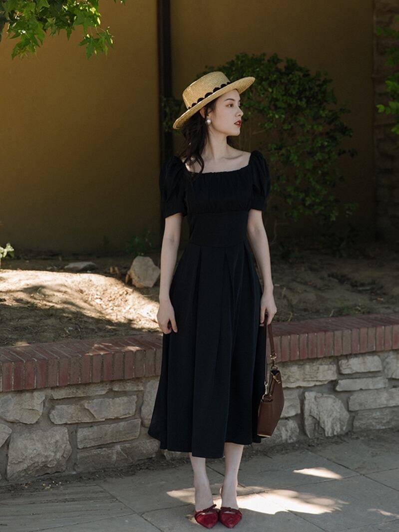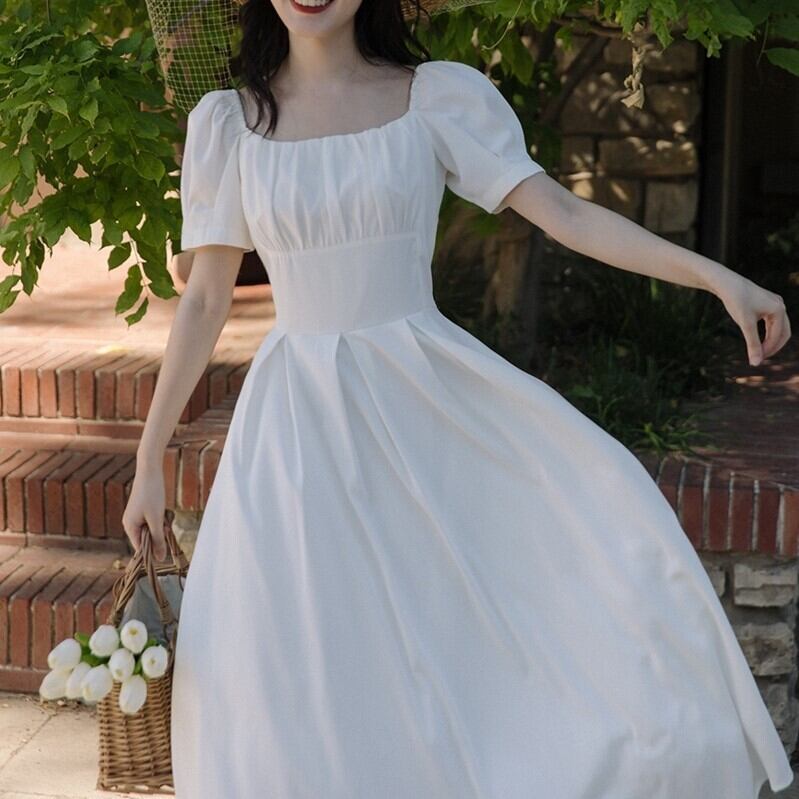ワンピース ワンピドレス ロング ロング丈 袖あり 半袖 パフスリーブ スクエアネック Aライン ウエストマーク ハイウエスト かわいい 大人可愛い シンプル カジュアル 大人 上品 おしゃれ お洒落 大人可愛い 大人女子 ラフ ラブリー キュート 無地 春 夏 10代 20代 30代 40代 レディース 女性用 着回し 普段使い 重ね着 韓国 韓国系 ファッション コーデ スタイル モテ S M L XL 白 ホワイト 黒 ブラック 赤 レッド | Raforea