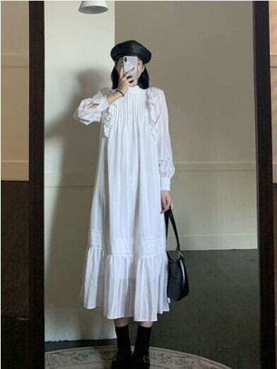 ワンピース ワンピドレス ロング ロング丈 袖あり 長袖 パフスリーブ スタンドカラー フリル かわいい 大人可愛い シンプル カジュアル 大人 おしゃれ お洒落 レトロ 大人可愛い 大人女子 こなれ感 ラブリー キュート ガーリー 無地 春 秋 10代 20代 30代 レディース 女性用 デート お出かけ 着回し 普段使い 重ね着 ファッション コーデ 楽ちん モテ インスタ映え S M L XL 白 ホワイト 黒 ブラック | Raforea