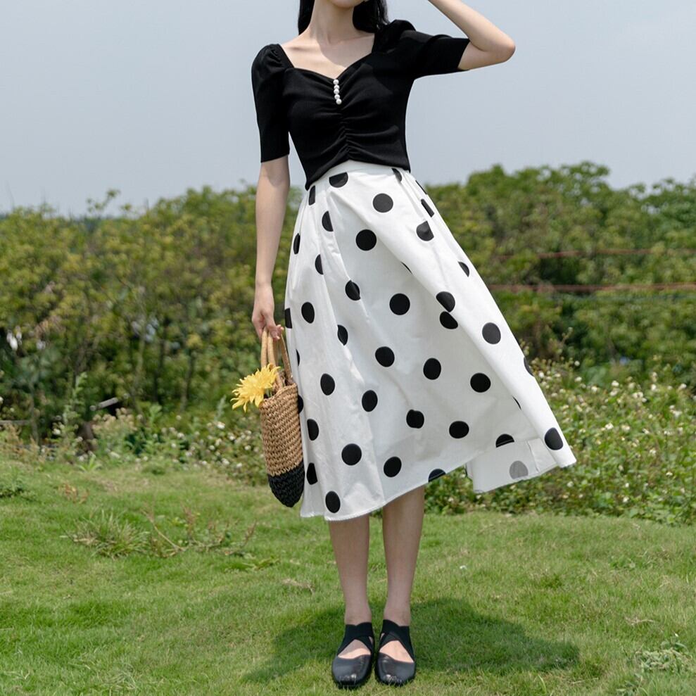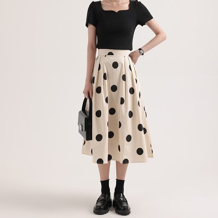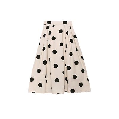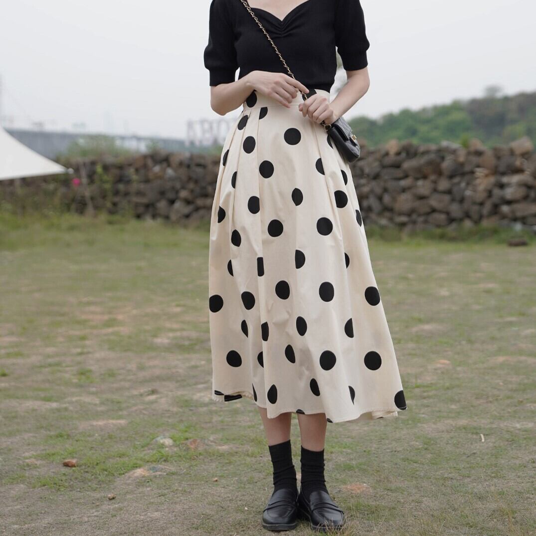 スカート ロングスカート フレアスカート ミモレ丈 フレア Aライン ウエストマーク 薄手 大人可愛い 上品 おしゃれ 大人女子 ドット柄 春 夏 10代 20代 レディース オフィス ビジネス 通勤 デート 普段使い 韓国 モテ 体系カバー 脚長 流行 S M L 白 ホワイト アプリコット | Raforea