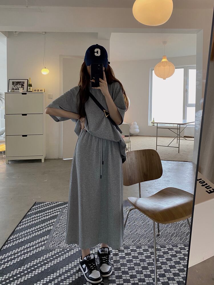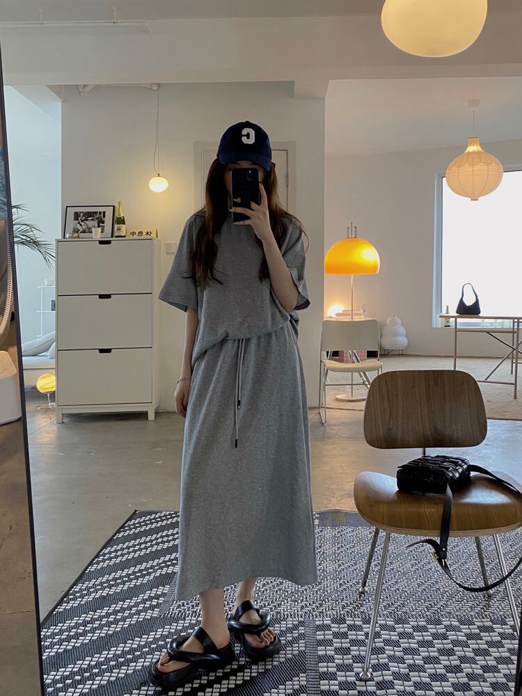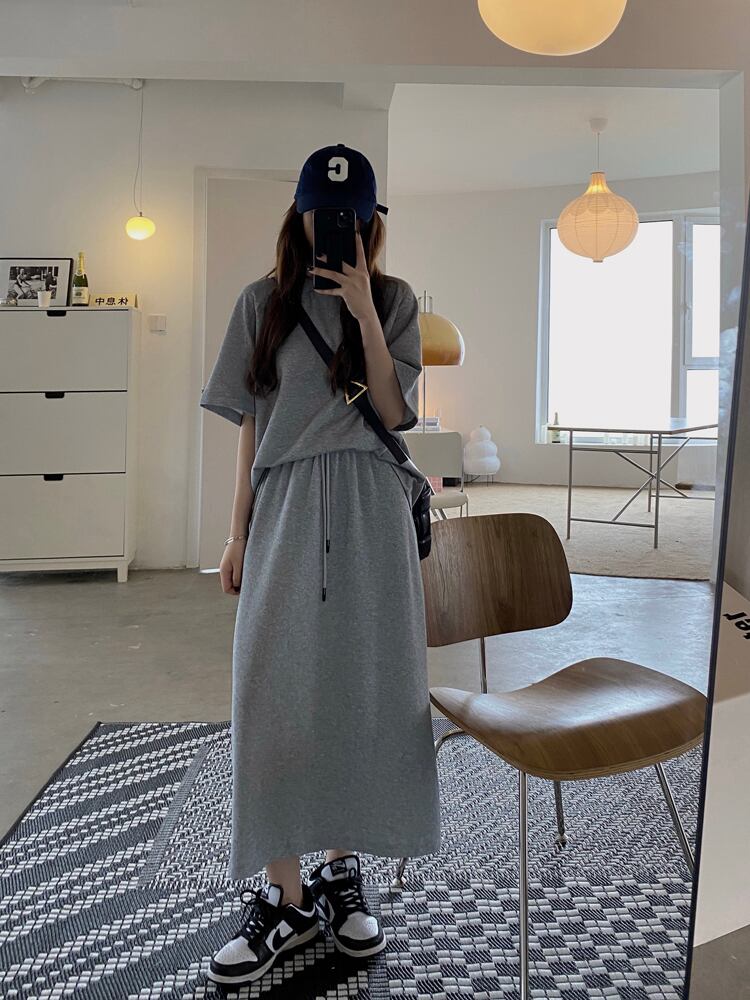 トップス スカート セットアップ Tシャツ ロングスカート ロング ロング丈 袖あり 半袖 ラウンドネック 3way 上下セット 2点セット かわいい 大人可愛い シンプル カジュアル 大人 おしゃれ お洒落 かっこいい 大人可愛い 大人女子 こなれ感 ラフ 無地 春 夏 10代 20代 30代 レディース 女性用 着回し 普段使い 韓国 韓国系 ファッション コーデ スタイル 楽ちん モテ S M 灰色 グレー | Raforea