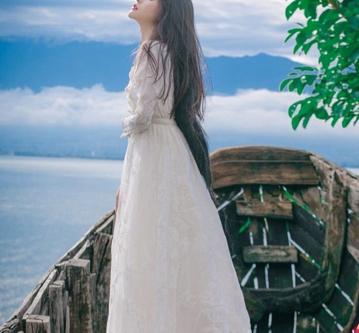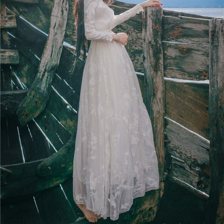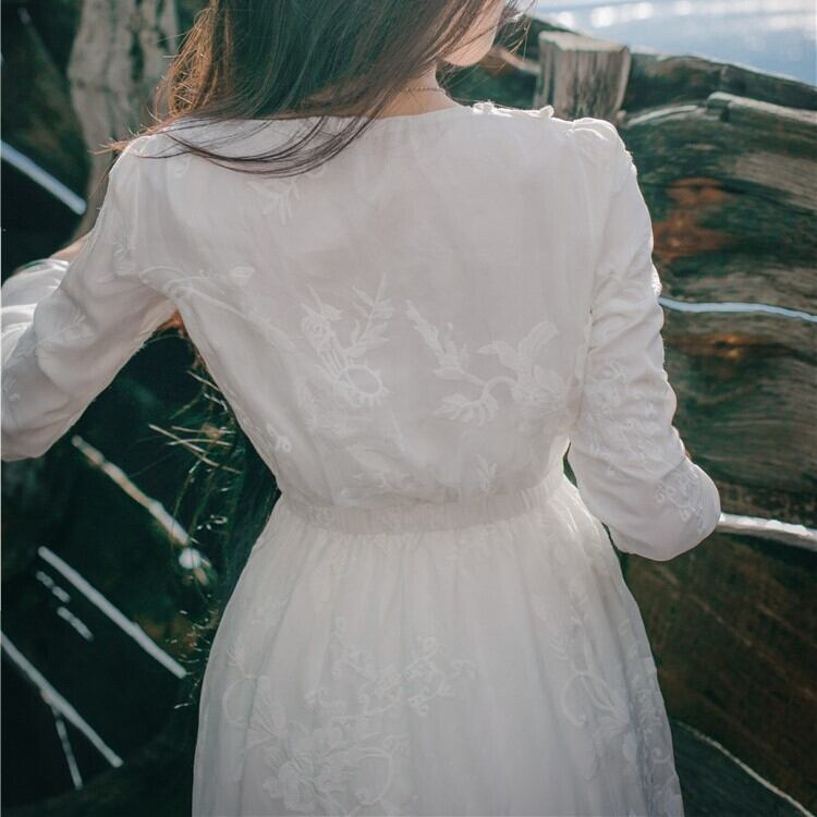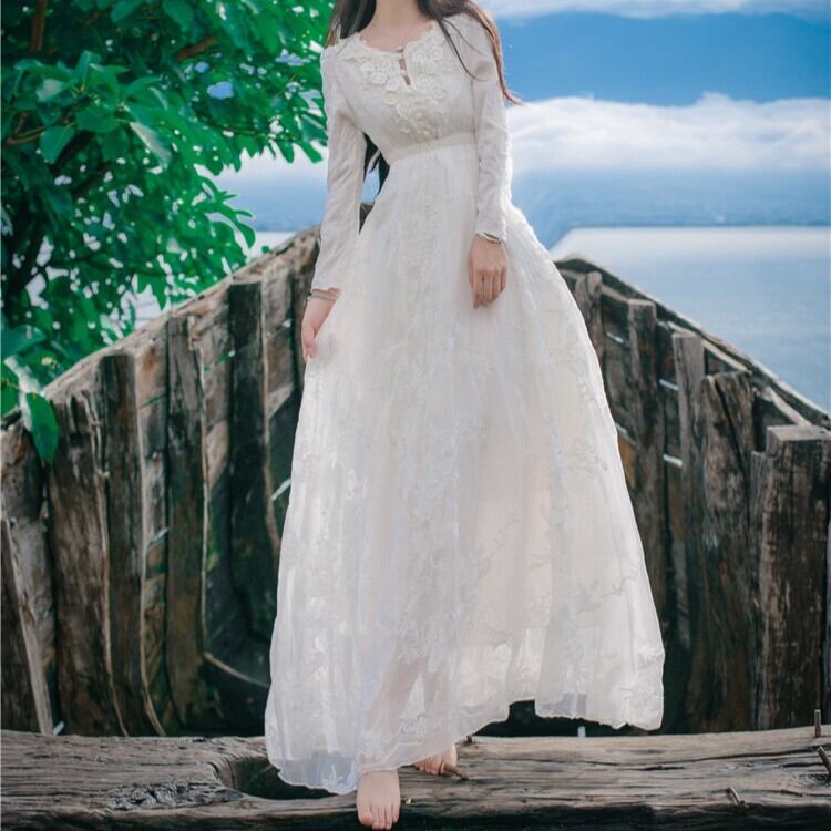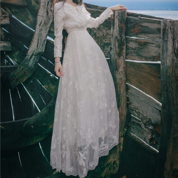 ワンピース ロングスカート ワンピドレス ロング ロング丈 マキシ マキシ丈 長袖 Vネック フレア レース ウエストマーク 透け感 薄手 かわいい 大人可愛い きれいめ 大人 上品 おしゃれ エレガント 主役級 柄 花柄 春 夏 10代 20代 30代 レディース マタニティ デート お出かけ 海 プール ガーデン 韓国 韓国系 オルチャン 楽ちん モテ 体系カバー 脚長 S M L 白 ホワイト | Raforea