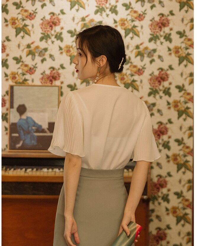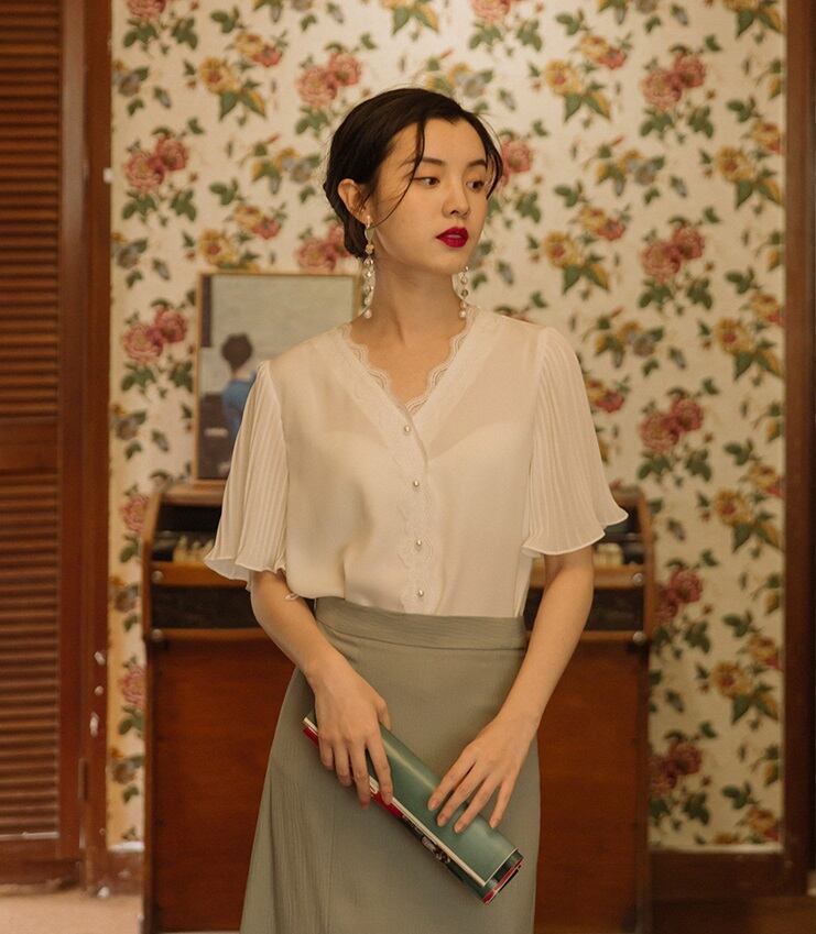 エレガントなシャツとレースがおしゃれなスカートのセットアップ