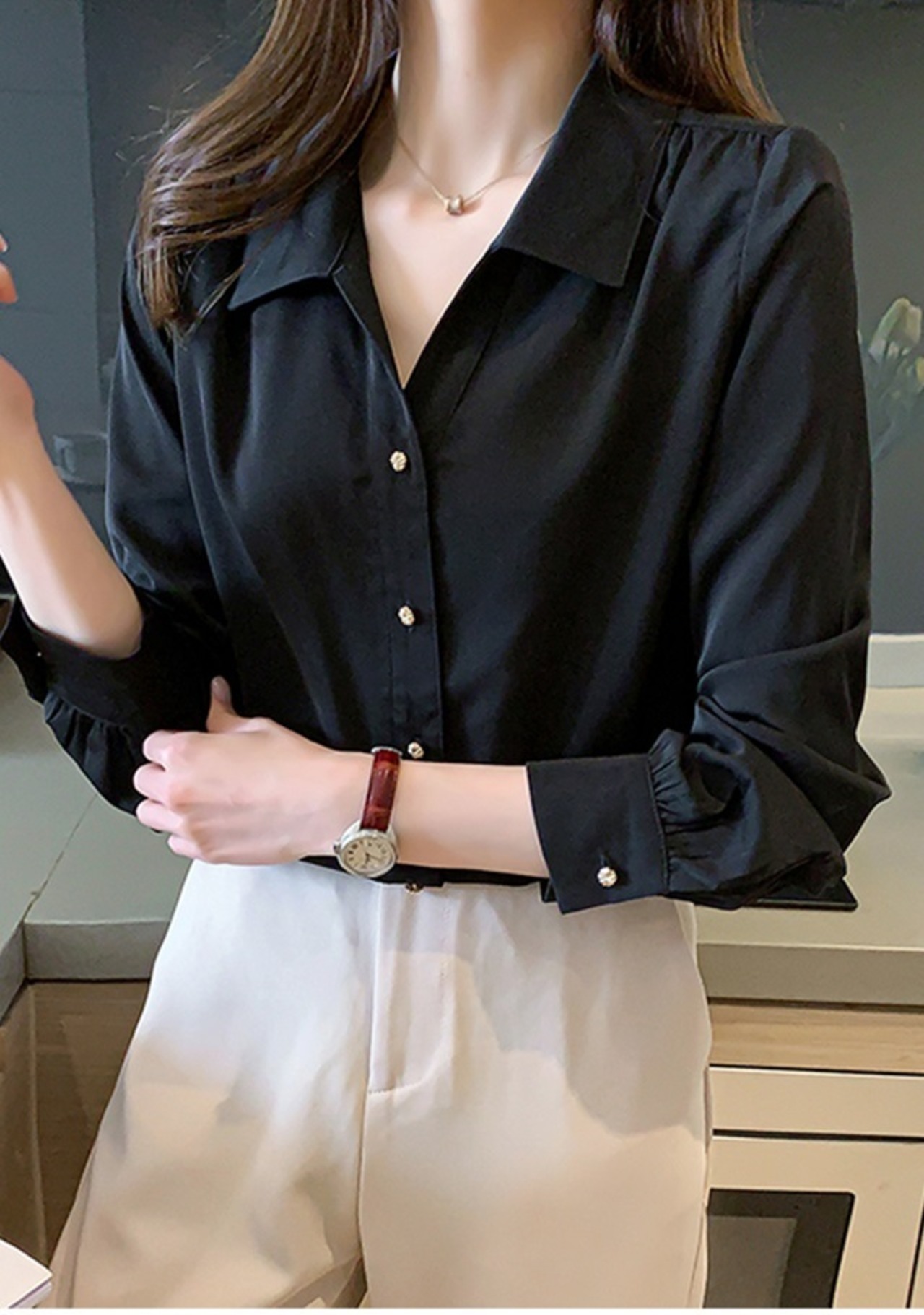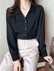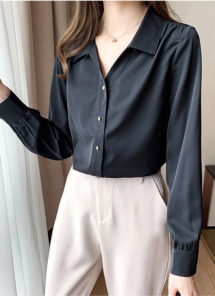 トップス シャツ ブラウス 袖あり 長袖 Vネック 襟付き 前開き 大人可愛い きれいめ シンプル 大人 上品 おしゃれ お洒落 かっこいい 大人女子 こなれ感 クール モード系 セクシー エレガント 無地 オールシーズン 10代 20代 30代 40代 レディース 女性用 OL 学生 着回し 普段使い 韓国 韓国系 ファッション コーデ スタイル モテ S 黒 ブラック | Raforea