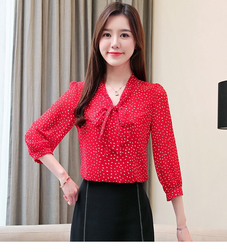 トップス シャツ ブラウス 袖あり 七分袖 Vネック スリム リボン かわいい 大人可愛い きれいめ 大人 上品 おしゃれ お洒落 大人可愛い 大人女子 こなれ感 個性的 エレガント 抜け感 ドット柄 水玉 春 夏 秋 10代 20代 30代 レディース 女性用 OL 学生 デート お出かけ 着回し 韓国 韓国系 ファッション コーデ スタイル モテ インスタ映え S M L XL 2XL 白 ホワイト 赤 レッド | Raforea