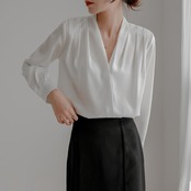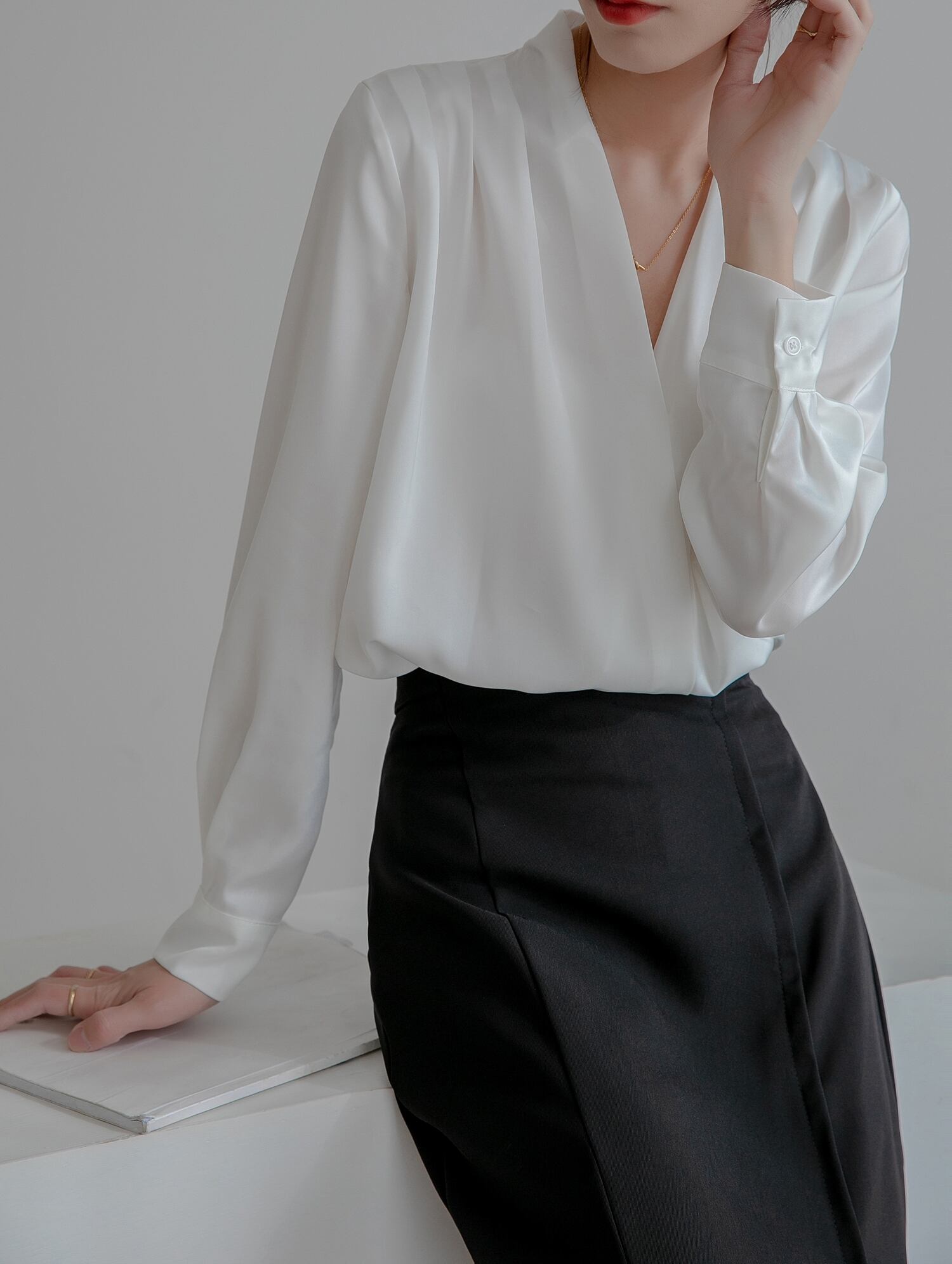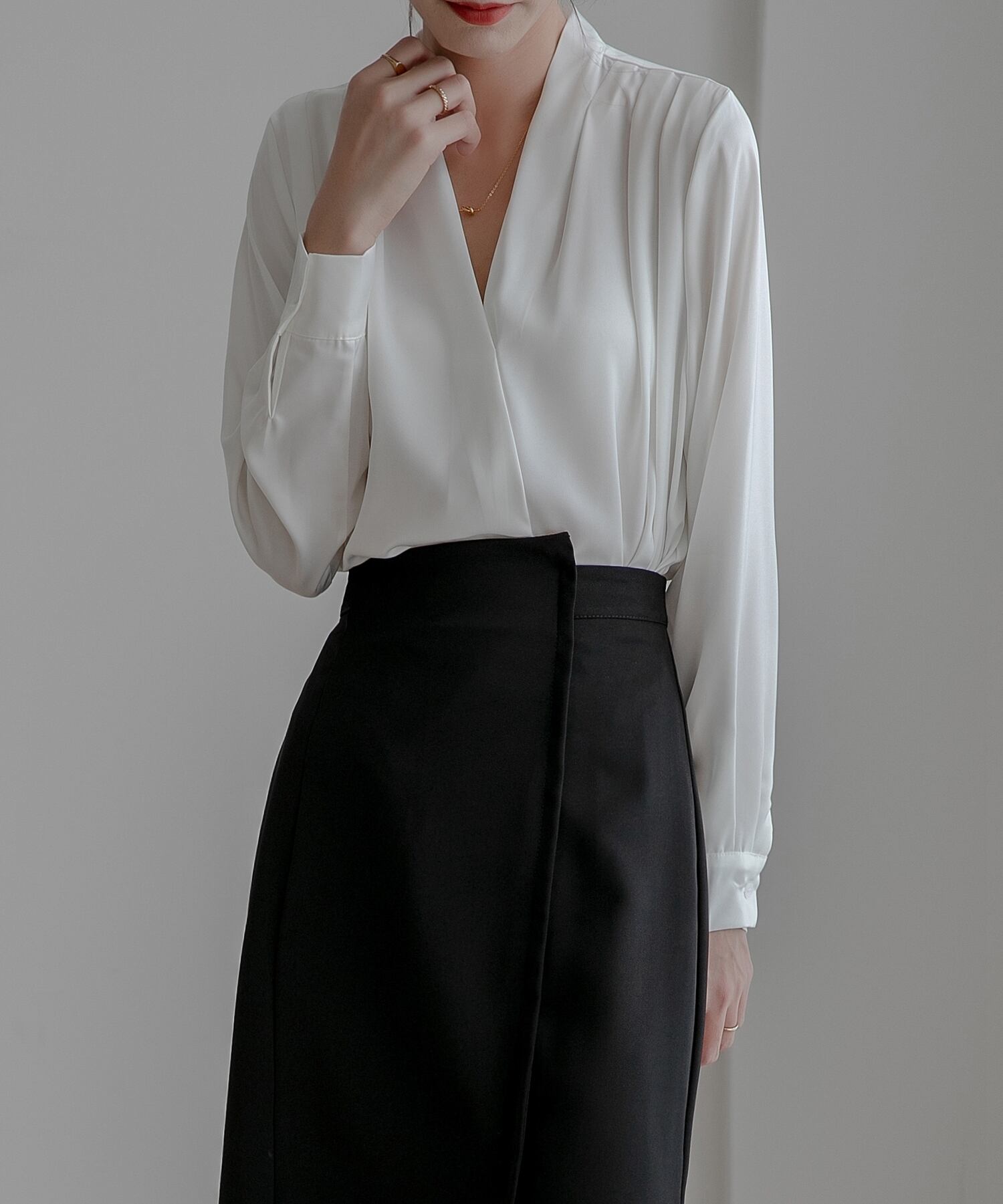 トップス シャツ ブラウス 白シャツ 白トップス 袖あり 長袖 Vネック きれいめ シンプル 大人 上品 おしゃれ お洒落 かっこいい 大人女子 こなれ感 セクシー エレガント フォーマル とろみ感 無地 オールシーズン シーズンレス 入学式 入園式 卒業式 卒園式 謝恩会 10代 20代 30代 40代 レディース 女性用 オフィス ビジネス OL 着回し モテ S M L XL 白 ホワイト ネイビー | Raforea