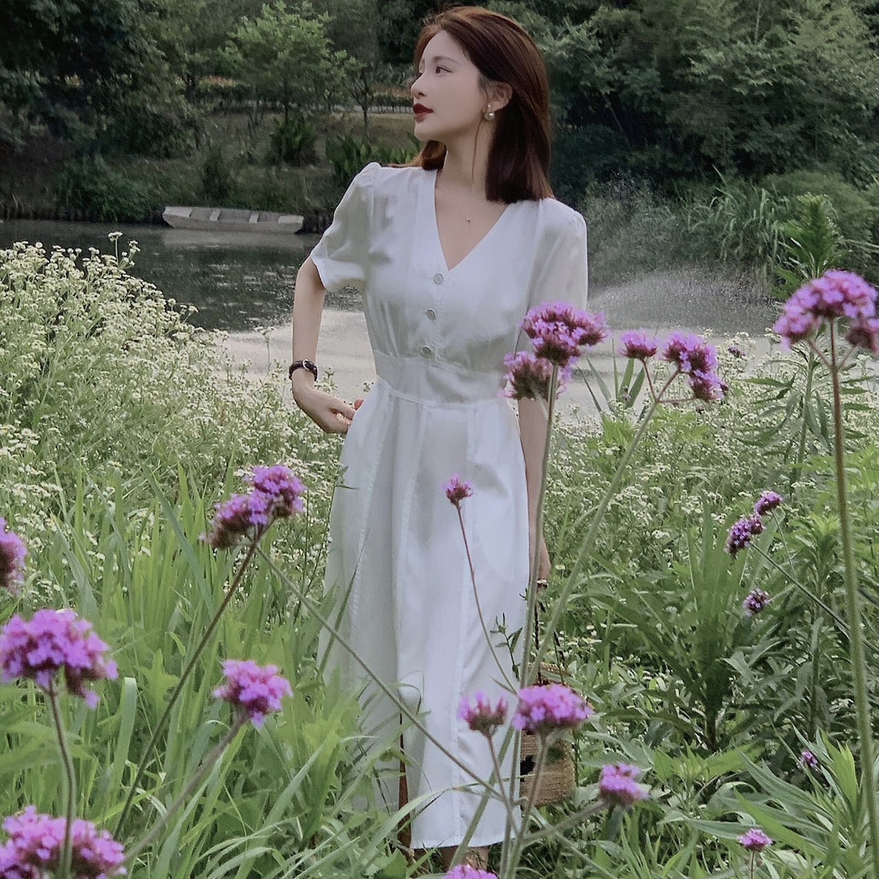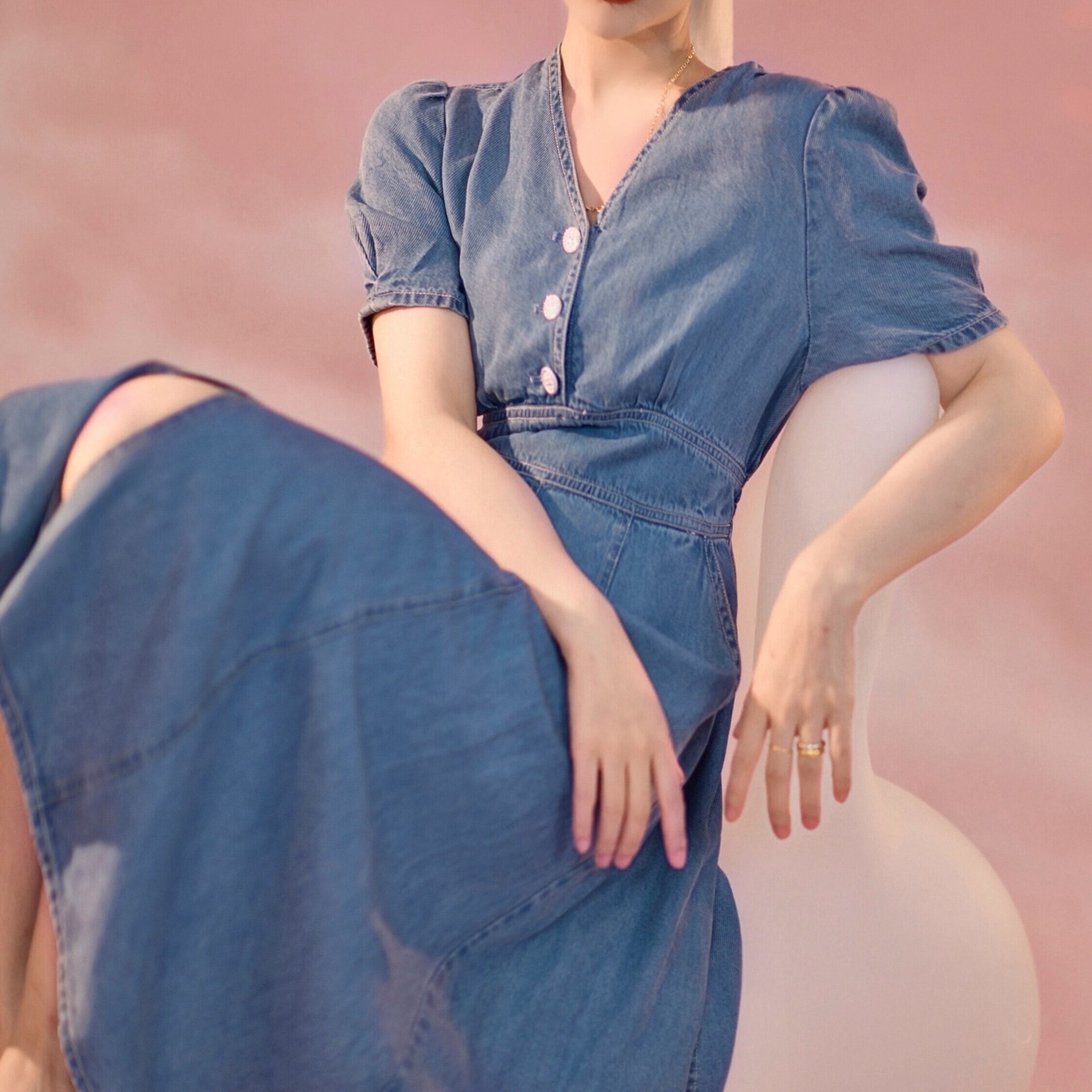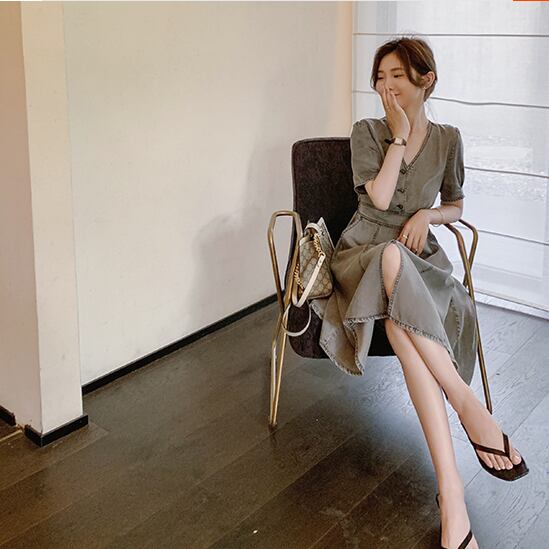 ワンピース デニムワンピース ワンピドレス 膝下 ミモレ丈 半袖 Vネック 襟なし Aライン ハイウエスト デニム 大人可愛い きれいめ シンプル 上品 おしゃれ 無地 夏 20代 30代 レディース OL 通勤 デート お出かけ リゾート 旅行 普段使い 韓国 トレンド S M L ホワイト グレー | Raforea