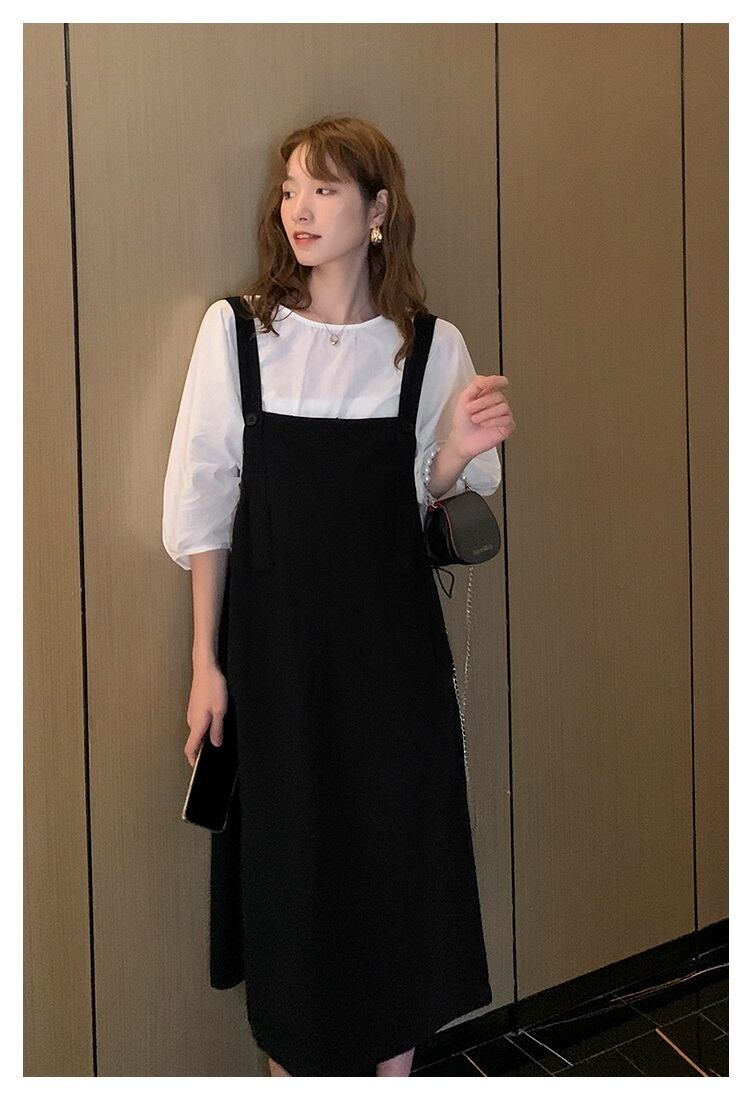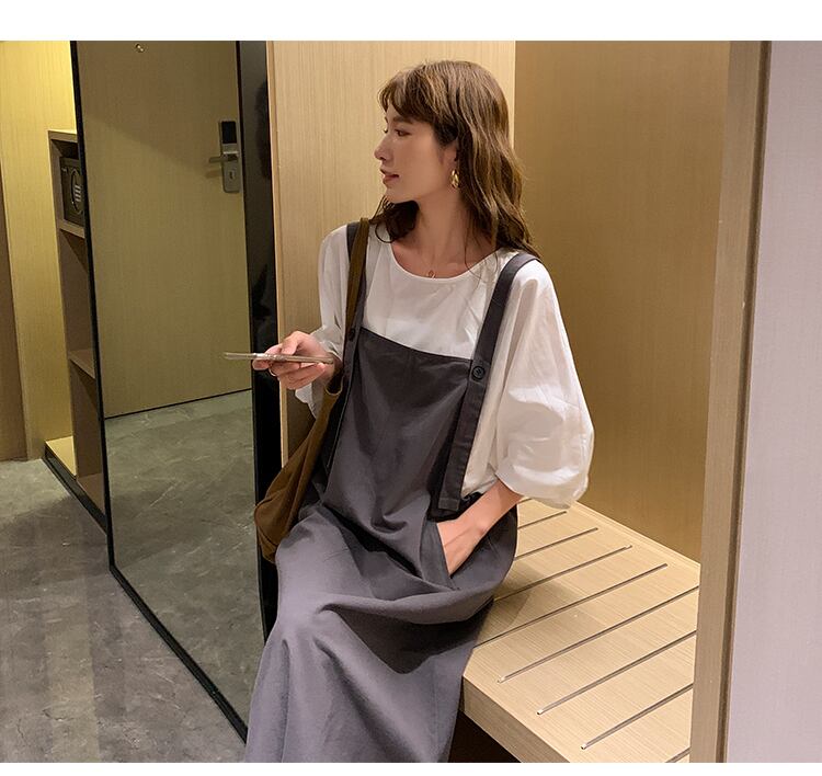 トップス スカート セットアップ ブラウス サロペット 白シャツ 膝丈 膝下 8分丈 袖あり 半袖 パフスリーブ ラウンドネック 綿 薄手 上下セット 2点セット かわいい おしゃれ 大人女子 ラフ 無地 夏 秋 20代 30代 通勤 お出かけ 休日 イベント 韓国 サイズ M L XL 色展開 ホワイト ブラック グレー | Raforea