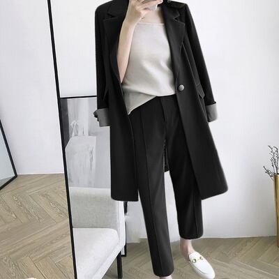 ロングジャケットと9分丈パンツのセットアップ。