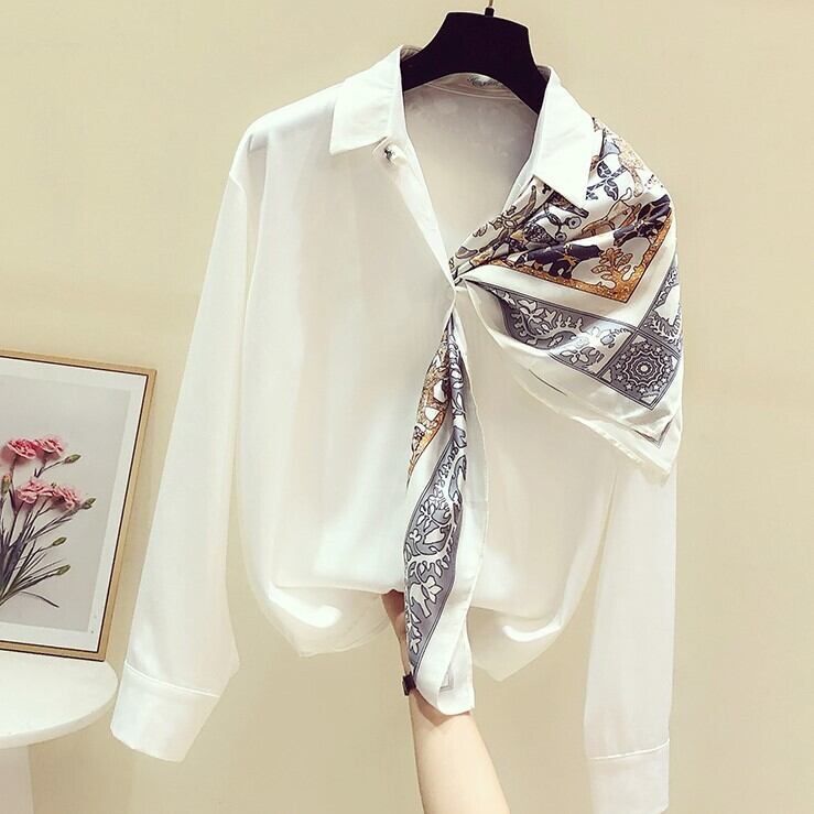 スカーフがついたエレガントな白シャツ