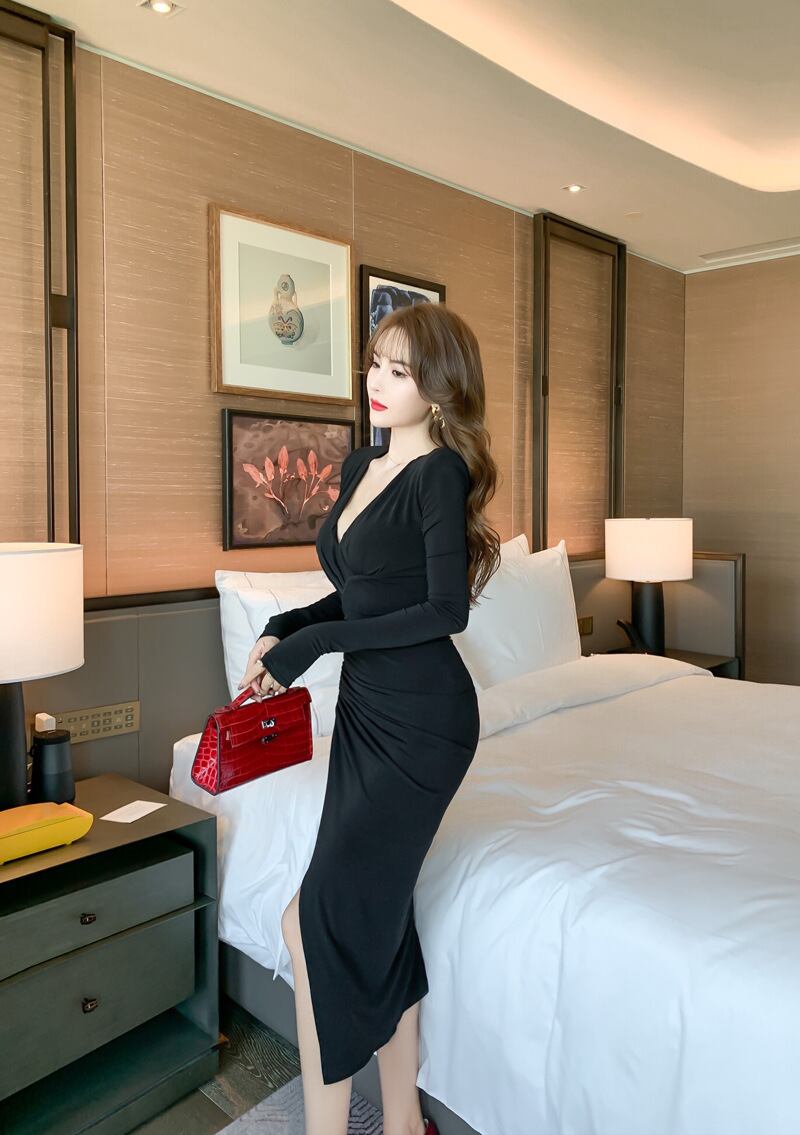 ワンピース ワンピドレス ミディアム丈 袖あり 長袖 Vネック スリム タイト アシンメトリー スリット ハイウエスト 大人 おしゃれ お洒落 かっこいい レトロ 大人女子 個性的 クール モード系 セクシー エレガント 無地 10代 20代 30代 レディース 女性用 パーティー イベント 韓国 韓国系 ファッション コーデ スタイル モテ S M L 黒 ブラック | Raforea