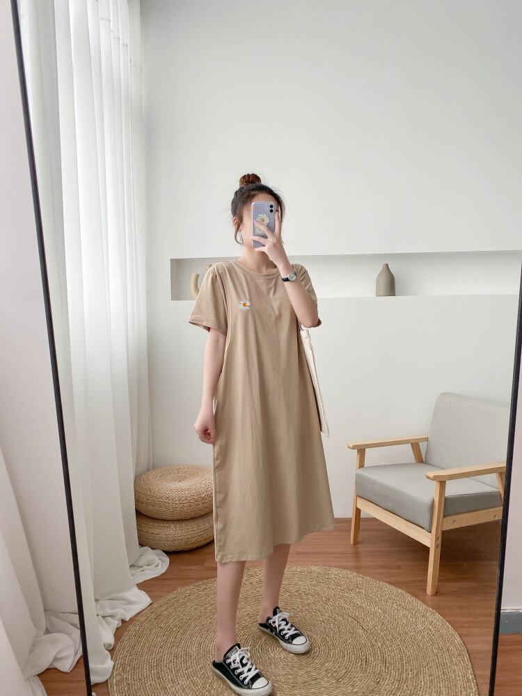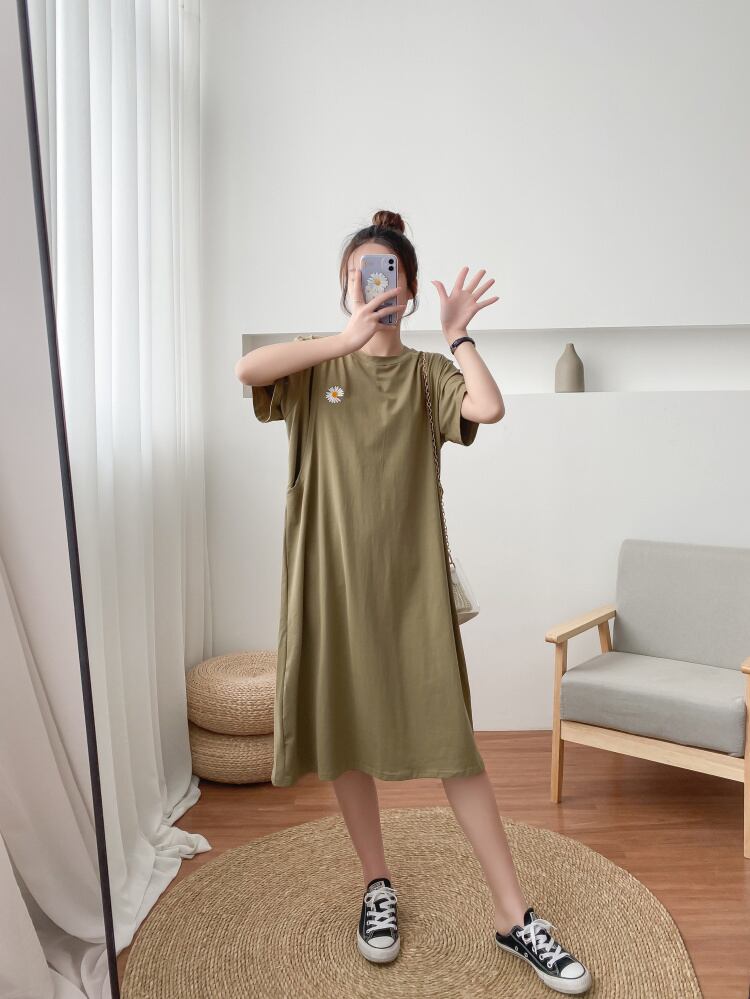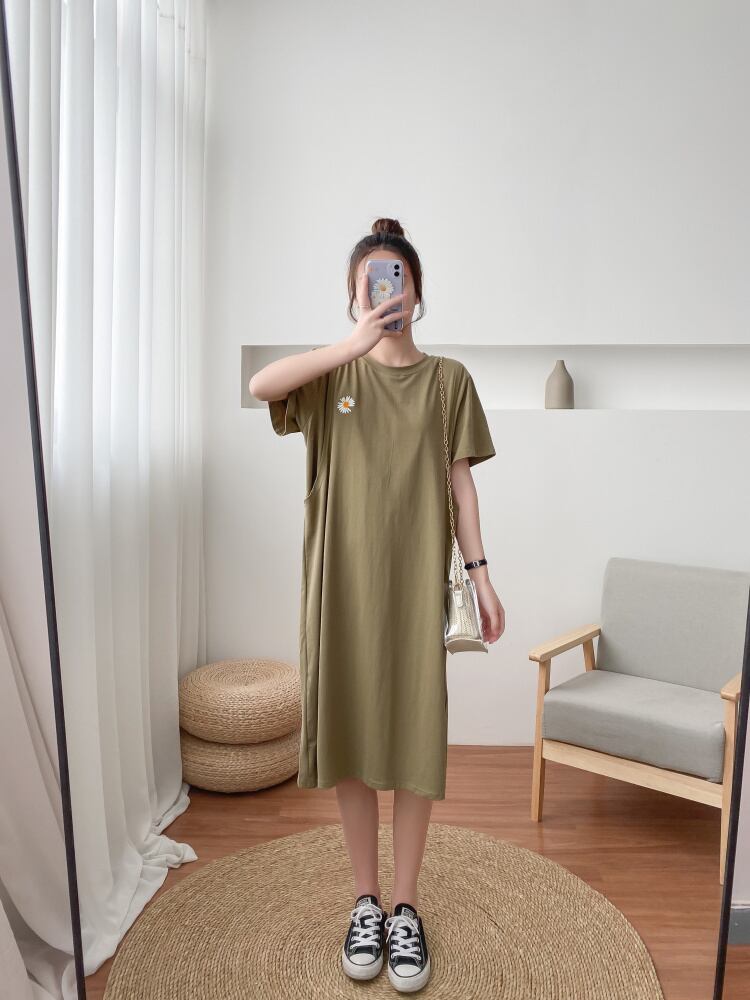 トップス プルオーバー チュニック 膝丈 膝下 袖あり 半袖 Uネック 襟なし Iライン 綿 大人 ラフ とろみ感 無地 夏 10代 20代 マタニティ お出かけ 旅行 コーデ 楽ちん サイズ L XL 2XL 3XL 色展開 カーキ アーミーグリーン | Raforea