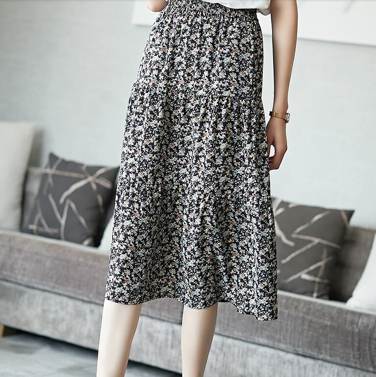 スカート フレアスカート ティアード 膝下 ミモレ ミモレ丈 フレア Aライン シフォン 薄手 大人可愛い きれいめ 上品 おしゃれ お洒落 レトロ 花柄 小花柄 フラワー ボタニカル 春 夏 秋 20代 30代 レディース OL デート お出かけ 女子会 お泊まり 休日 リゾート 旅行 普段使い ファッション 脚長 S M L XL 2XL 3XL 黒 | Raforea