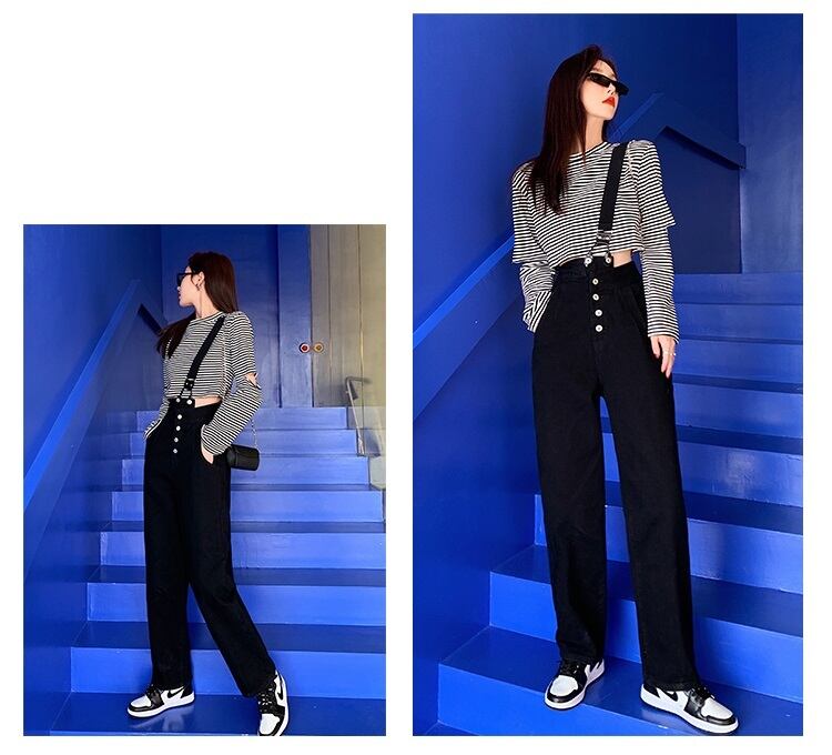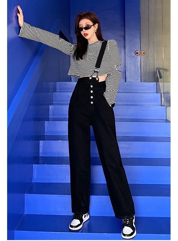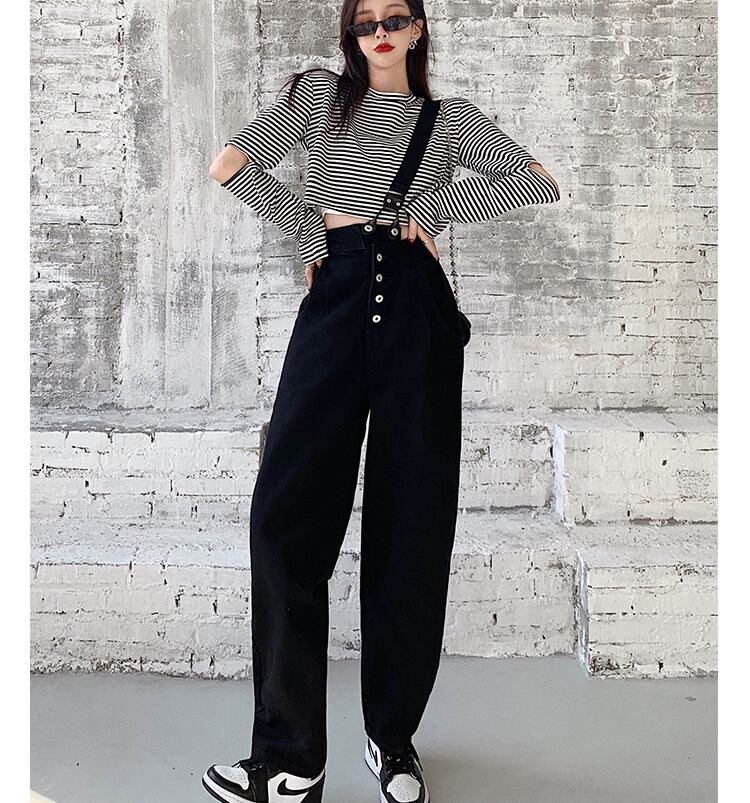 パンツ Tシャツ サロペット クロップド ひざ丈 ロング丈 袖あり 長袖 ボリューム袖 ラウンドネック 襟なし 細身 ストレート Iライン 前開き 薄手 上下セット 2点セット カジュアル かっこいい 個性的 クール 存在感 ボーダー 春 10代 20代 学生 お出かけ 公園デビュー 女子会 コーデ 楽ちん 脚長 サイズ S M L 色展開 黒(パンツ) 白×黒(クロップド) | Raforea