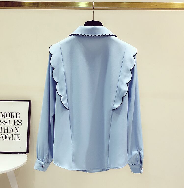 トップス シャツ ブラウス 長袖 襟付き シフォン フリル 前開き ポリエステル かわいい 上品 おしゃれ ラブリー キュート ガーリー 個性的 無地 春 入学式 入園式 謝恩会 10代 20代 レディース オフィス OL 通勤 デート 着回し 普段使い 韓国 モテ 新作 M L XL 2XL 3XL 白 ブルー ベージュ ピンク 春カラー | Raforea
