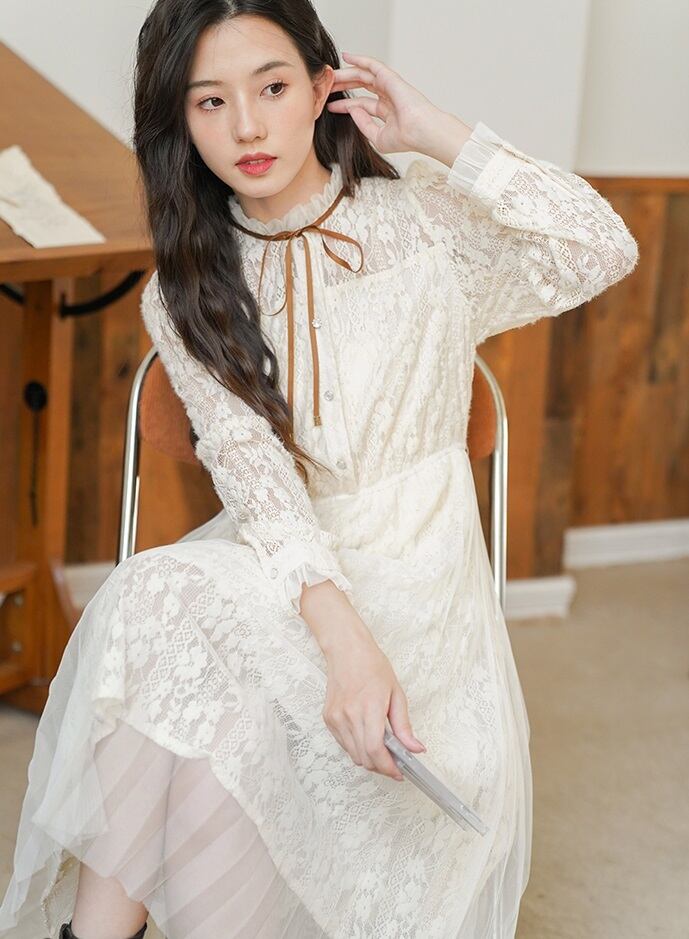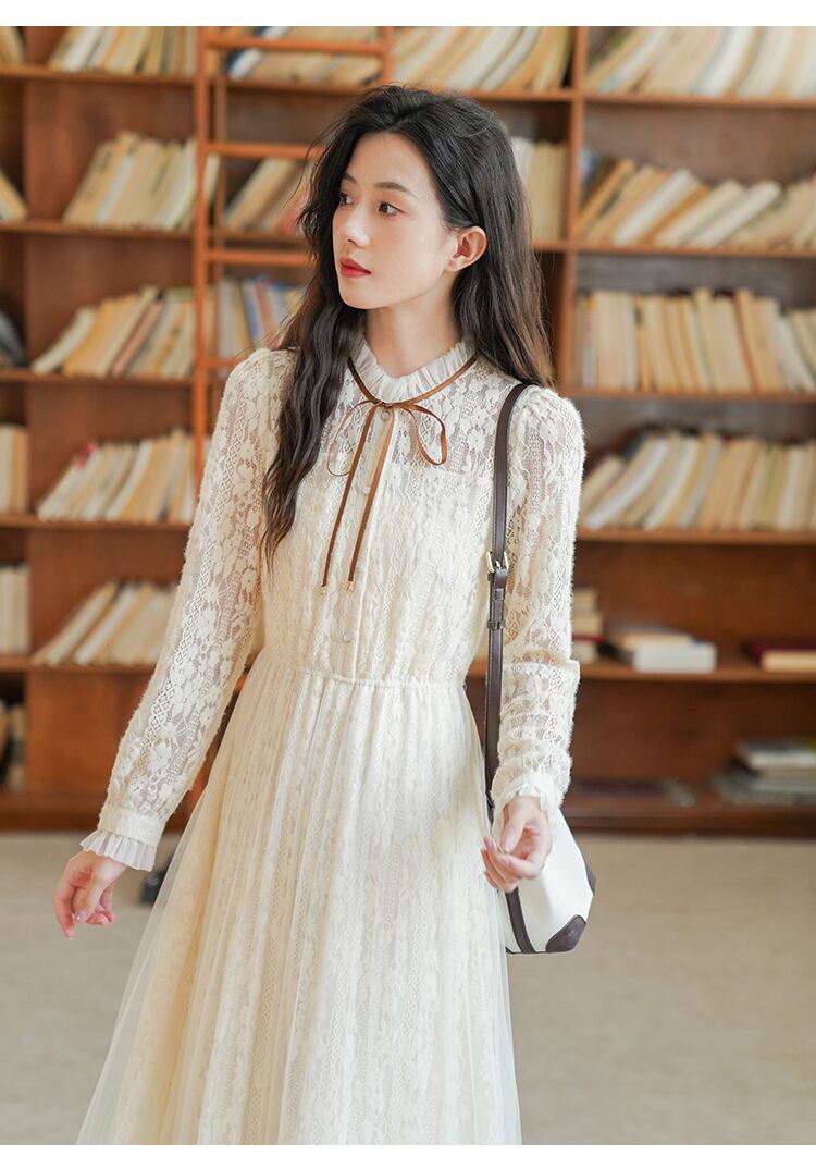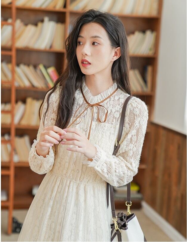ワンピース ワンピドレス ロング ロング丈 袖あり 長袖 襟付き スタンドカラー Aライン レース フリル リボン ハイウエスト 透け感 かわいい 大人可愛い シンプル 大人 おしゃれ お洒落 レトロ 大人可愛い 大人女子 こなれ感 ラブリー キュート ガーリー 個性的 10代 20代 30代 レディース 女性用 デート お出かけ パーティー イベント 韓国 韓国系 モテ インスタ映え S M L XL アプリコット | Raforea