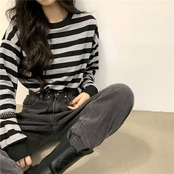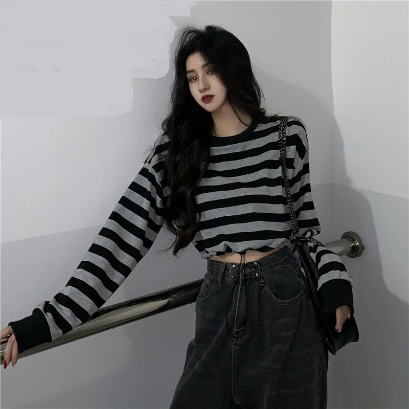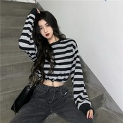 トップス Tシャツ 上着 クロップド 袖あり 長袖 パフスリーブ ラウンドネック ワイド 刺繍 サマーニット カジュアル かっこいい レトロ 大人可愛い こなれ感 ボーイッシュ モード系 柄 ボーダー シマ 春 秋 10代 20代 30代 休日 運動 韓国系 サイズ フリーサイズ 色展開 白と黒の縞 黒と灰の縞 | Raforea