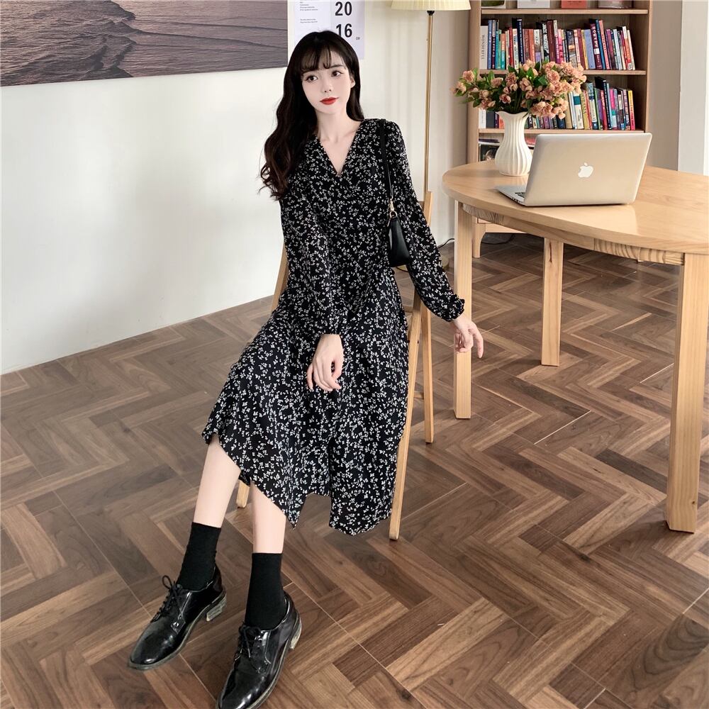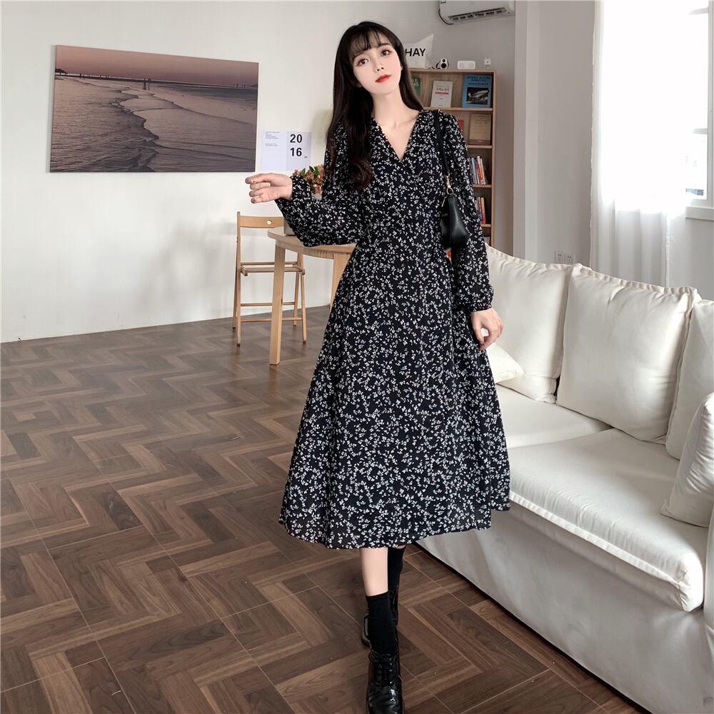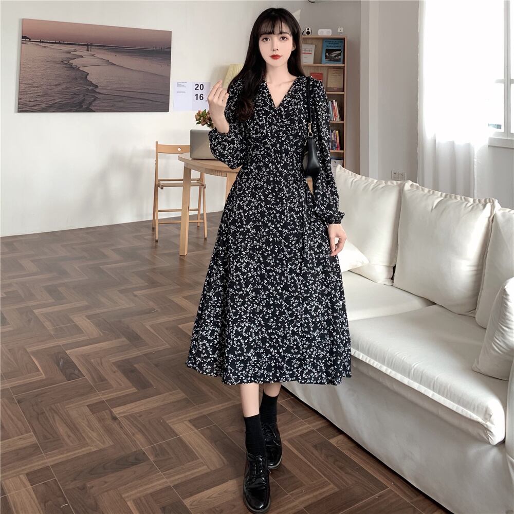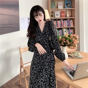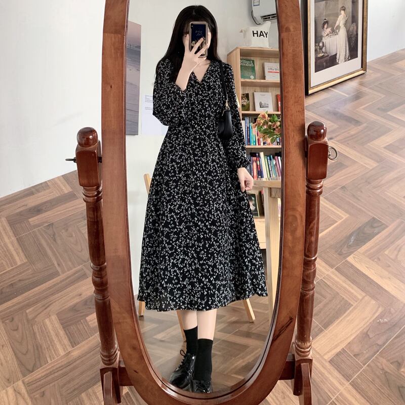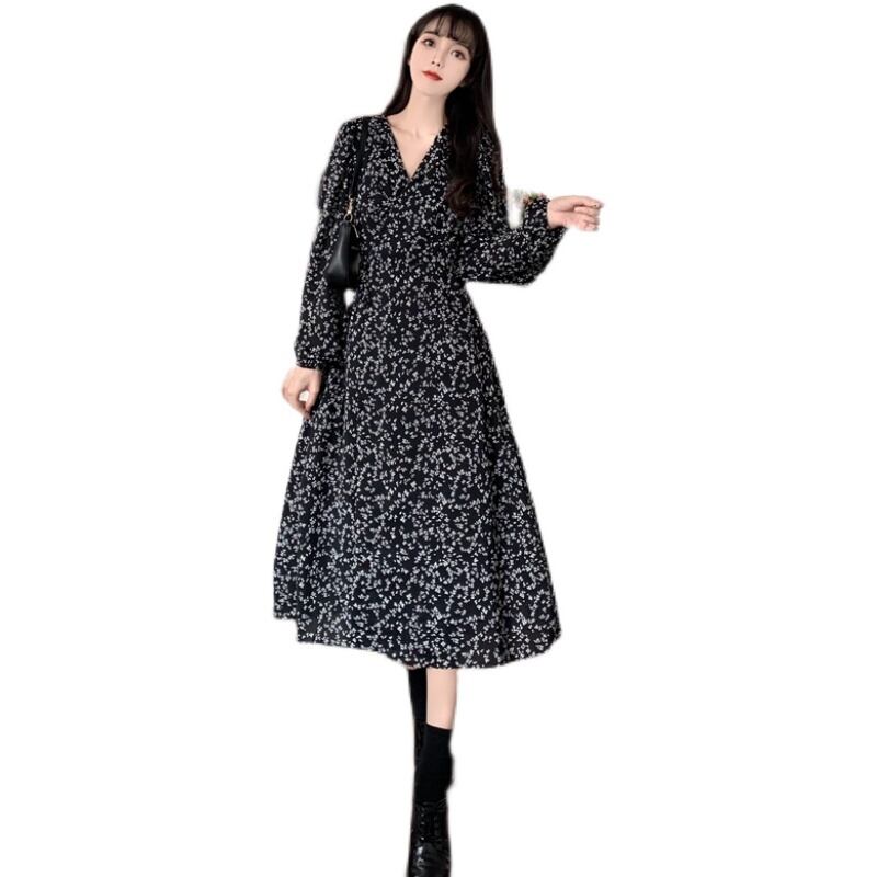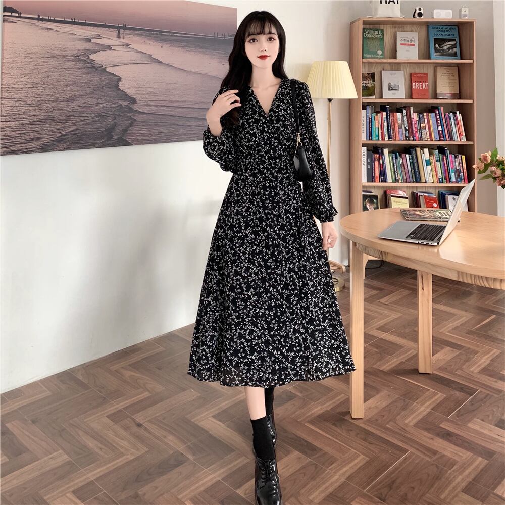 ワンピース カットソー プルオーバー フレアワンピース 膝丈 膝下 袖あり 長袖 パフスリーブ Vネック フレア Aライン シフォン 大人可愛い 大人 エスニック 小花柄 春 夏 秋 20代 30代 40代 通勤 お出かけ サイズ M L XL 2XL 3XL 4XL 大きいサイズ 色展開 ブラック | Raforea