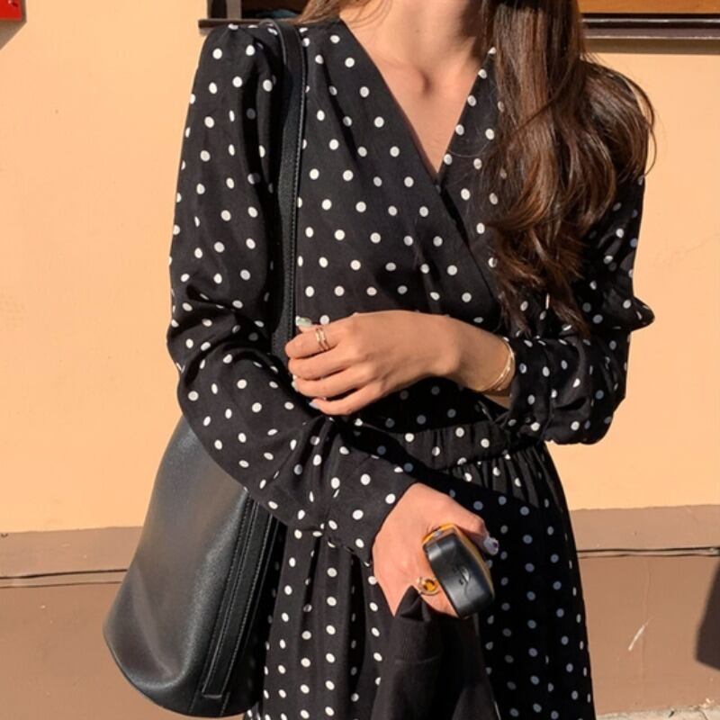 ワンピース デート プルオーバー ティアードワンピース ワンピドレス 膝下 ロング丈 マキシ丈 袖あり 長袖 Vネック 襟なし フレア Aライン シフォン ハイウエスト かわいい 大人可愛い きれいめ 大人 上品 おしゃれ お洒落 レトロ 大人可愛い 大人女子 こなれ感 ラフ ラブリー キュート ガーリー エレガント モダン 存在感 とろみ感 抜け感 ドット柄 水玉 春 秋 レディース ビジネス OL 通勤 学生 通学 デート お出かけ 女子会 休日 モテ S M L XL ブラック 黒 | Raforea