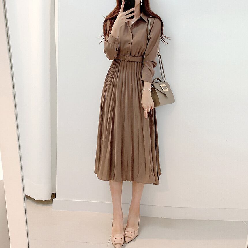 ワンピース フレアワンピース 膝下 ミモレ ミモレ丈 ロング ロング丈 袖あり 長袖 襟付き フレア プリーツ ベルト ウエストマーク ハイウエスト きれいめ シンプル 大人 上品 おしゃれ お洒落 レトロ こなれ感 エレガント 無地 春 秋 20代 30代 OL 通勤 デート お出かけ お泊まり 休日 普段使い 韓国系 ファッション 脚長 S M L XL ブラウン ベージュ | Raforea