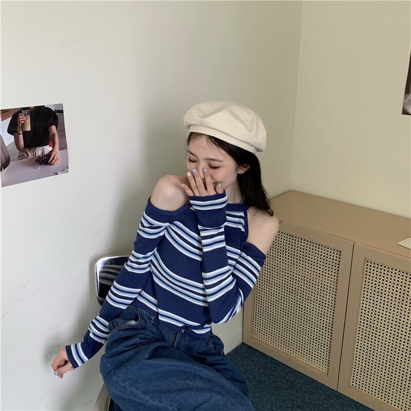 トップス ニット ミニ丈 袖あり 長袖 ホルターネック 肩あき スリム タイト 細身 かわいい シンプル カジュアル 大人 おしゃれ かっこいい 大人可愛い 大人女子 ラフ メンズライク 個性的 クール モード系 セクシー エレガント ボーダー 秋 10代 20代 レディース 女性用 デート お出かけ 女子会 休日 リゾート 旅行 S M L 白 ホワイト 青 ブルー | Raforea