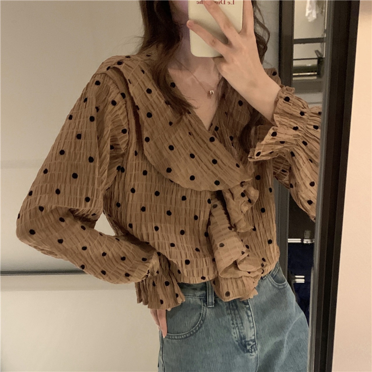 トップス シャツ 襟なし Vネック 袖あり 長袖 シフォン ふわふわ ポリエステル ボタン かわいい 大人可愛い きれいめ カジュアル おしゃれ 大人女子 こなれ感 抜け感 存在感 個性的 レトロ キュート 春 秋 ドット柄 10代 20代 30代 40代 レディース 学生 女の子 ママ デート お出かけ 女子会 休日 イベント 旅行 リゾート 普段使い 韓国系コーデ スタイル 楽ちん 体系カバー モテ プレゼント ギフト 誕生日 S M L ベージュ ブラウン | Raforea