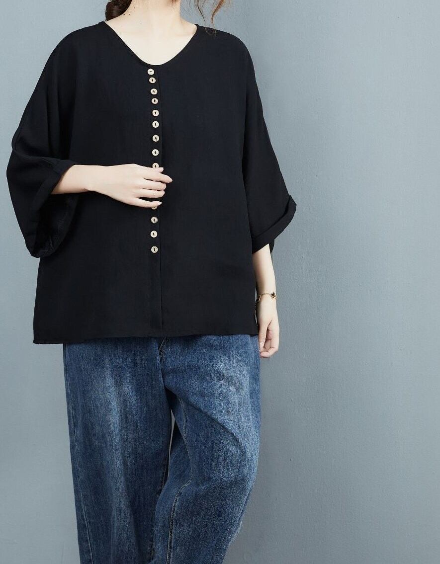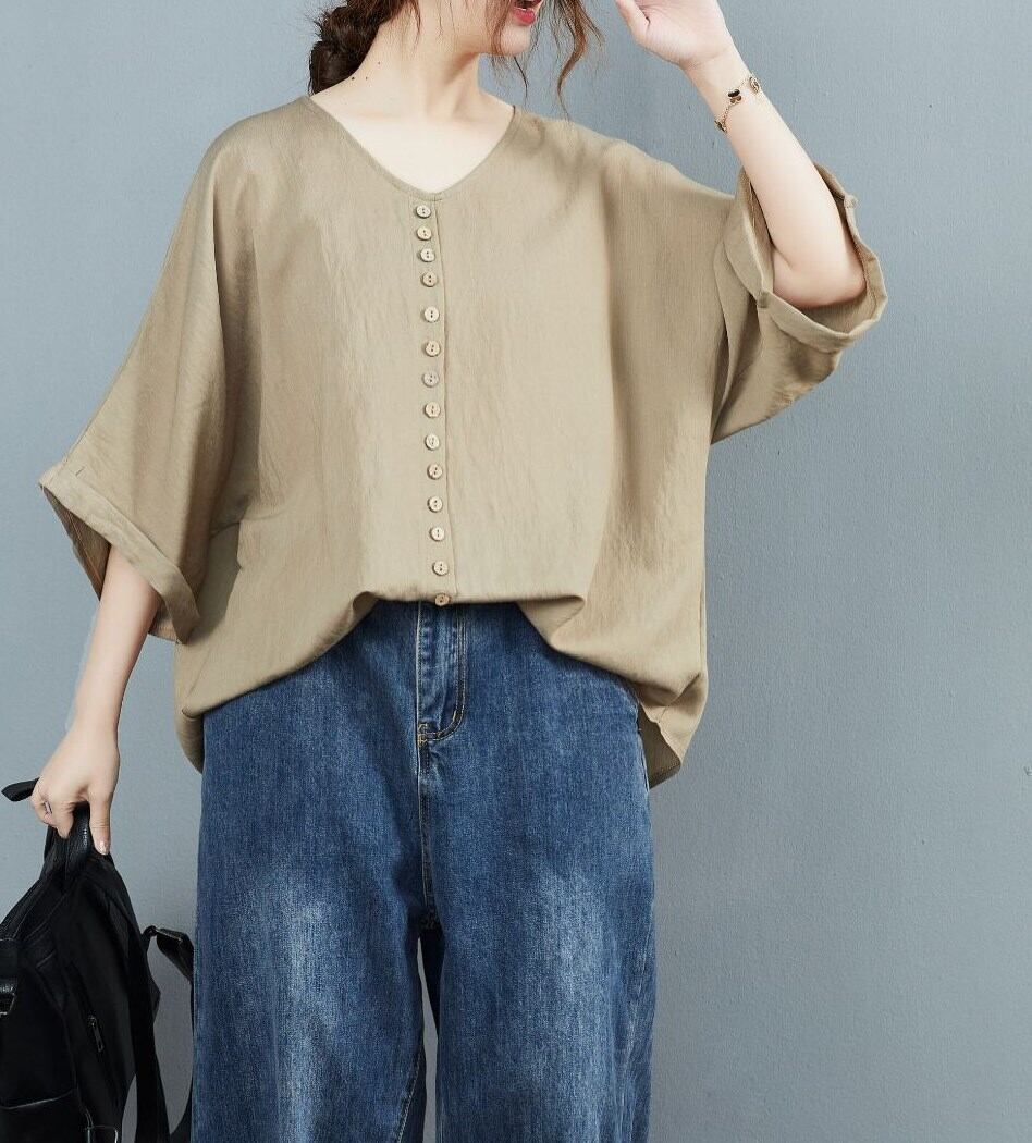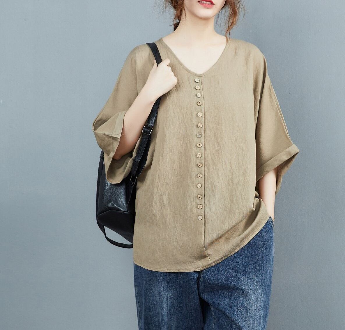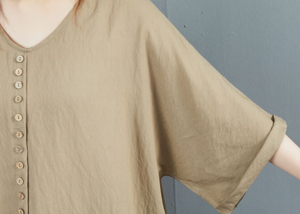トップス Tシャツ 襟なし Vネック 袖あり 半袖 5分袖 綿 麻 ボタン かわいい 大人可愛い シンプル カジュアル おしゃれ 大人女子 こなれ感 抜け感 存在感 個性的 ルーズ ラフ ゆる キュート 夏 無地 10代 20代 30代 40代 50代 レディース 学生 女の子 ママ マタニティ デート お出かけ 女子会 休日 イベント 旅行 リゾート 海 アウトドア 普段使い 韓国系 コーデ スタイル 楽ちん 体系カバー モテ プレゼント ギフト 誕生日 L XL カーキ グリーン ブラック | Raforea