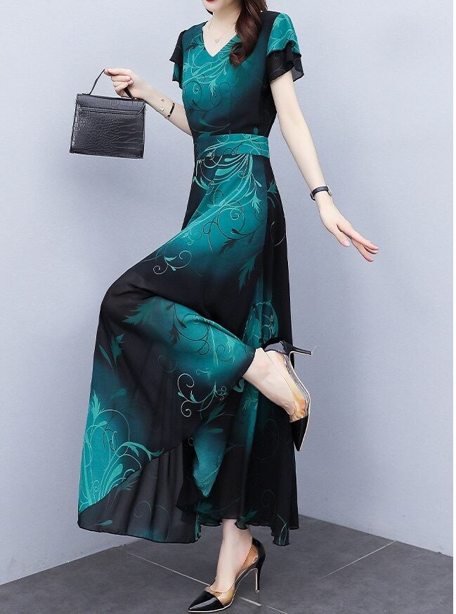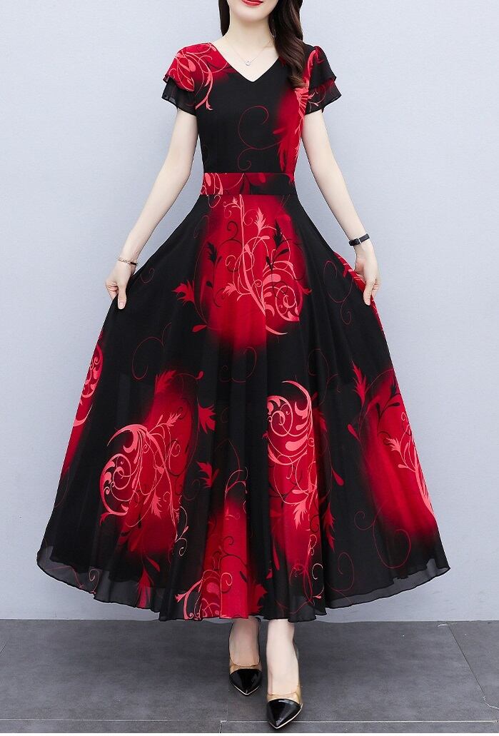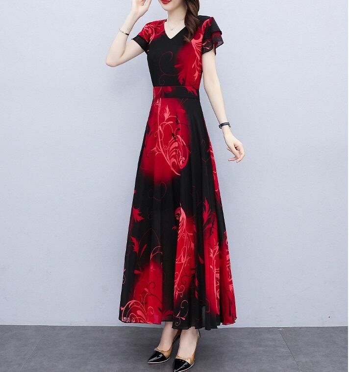ワンピース ロングスカート ワンピドレス ロング ロング丈 袖あり 半袖 Vネック きれいめ 大人 上品 おしゃれ お洒落 レトロ エキゾチック 大人女子 こなれ感 セクシー エレガント モダン 主役級 存在感 柄 春 夏 謝恩会 結婚式 二次会 披露宴 10代 20代 30代 40代 女性用 女の子 韓国 韓国系 ファッション コーデ スタイル M L XL 2XL 3XL 4XL 大きいサイズ ビッグサイズ 赤 レッド 緑 グリーン | Raforea