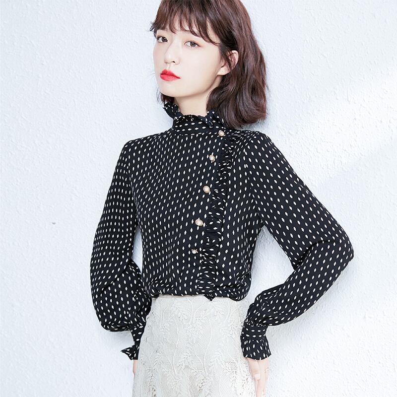 トップス シャツ 袖あり 長袖 襟付き スタンドカラー フリル かわいい 大人可愛い カジュアル 大人 おしゃれ お洒落 かっこいい レトロ 大人可愛い 大人女子 こなれ感 キュート 個性的 主役級 存在感 ドット柄 水玉 10代 20代 30代 レディース 女性用 韓国 韓国系 ファッション コーデ スタイル モテ インスタ映え S M L XL 2XL 黒 ブラック | Raforea
