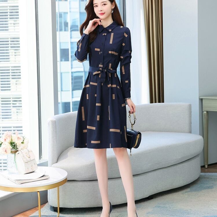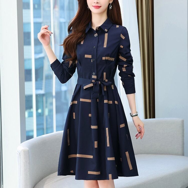 ワンピース シャツワンピース ミニ丈 膝上 袖あり 長袖 襟付き フレア スリム リボン ベルト ウエストマーク ウエストリボン 前開き 大人可愛い きれいめ シンプル 大人 上品 おしゃれ かっこいい 柄 春 秋 20代 30代 40代 50代 レディース 女性用 マタニティ OL 通勤 お出かけ 女子会 休日 リゾート 旅行 海 プール ホテル レストラン トレンド インスタ映え S M L XL 2XL ネイビー | Raforea