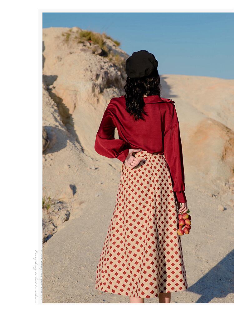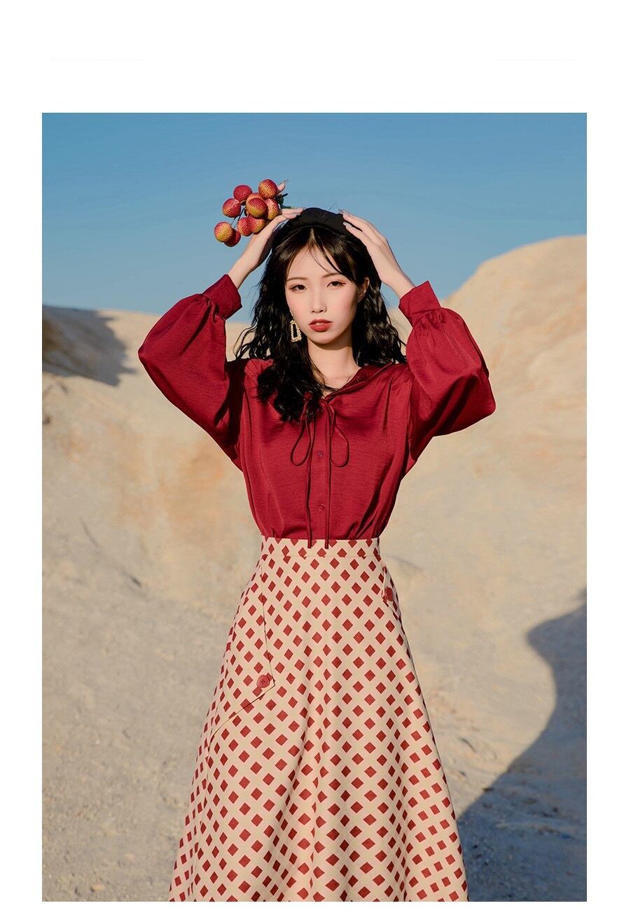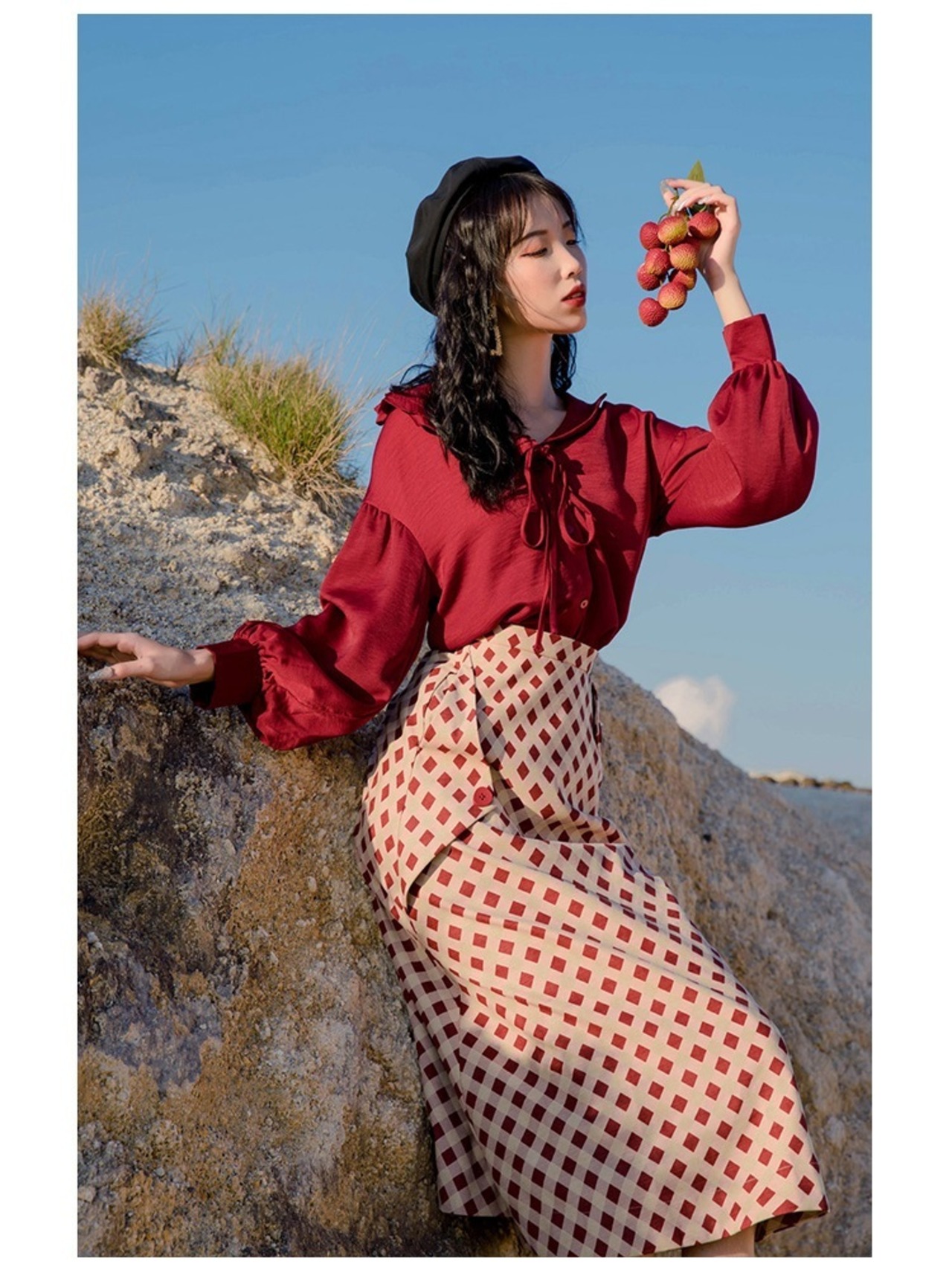 トップス スカート セットアップ ブラウス カットソー フレアスカート マキシ丈 袖あり 長袖 Vネック 襟付き Aライン ウエストマーク 前開き ポリエステル 上下セット 2点セット かわいい シンプル レトロ アジアン こなれ感 個性的 格子柄 秋 冬 10代 20代 30代 お出かけ 女子会 お泊まり 休日 普段使い 楽ちん サイズ S M L 色展開 ワインレッド 秋カラー | Raforea