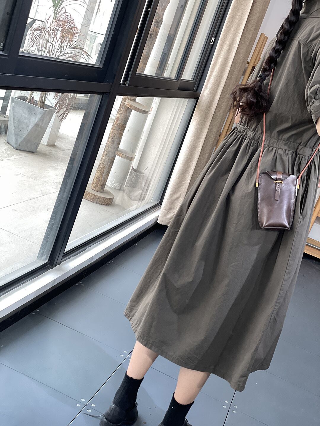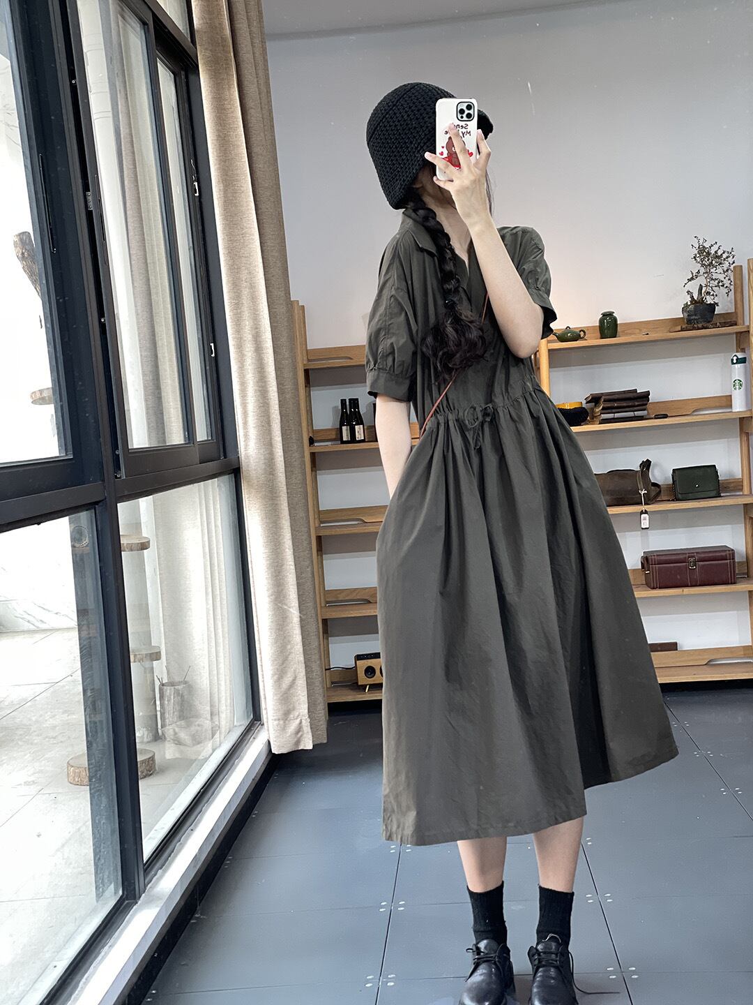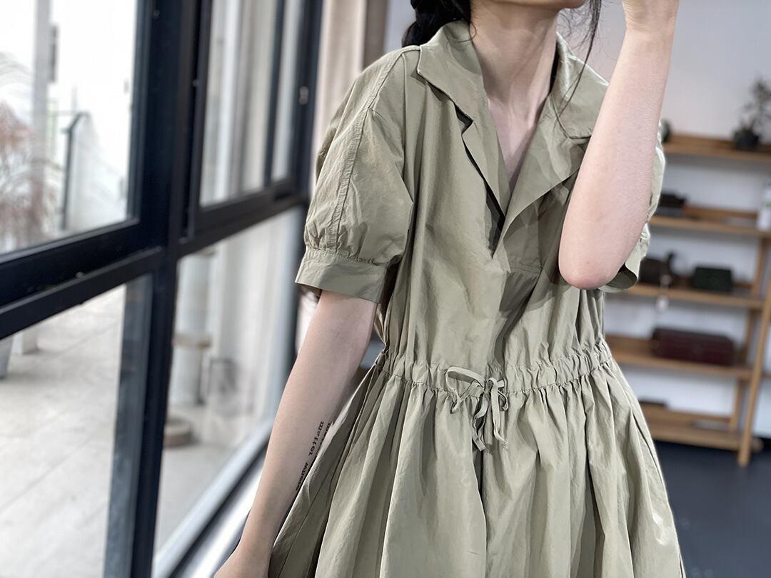 ワンピース シャツワンピース ひざ丈 ミモレ丈 ミディアム丈 袖あり 半袖 五分袖 パフスリーブ Vネック 襟付き フレア Aライン ウエストマーク ウエストリボン かわいい 大人可愛い きれいめ シンプル カジュアル 大人 上品 おしゃれ お洒落 かっこいい レトロ 大人可愛い 大人女子 こなれ感 ラブリー キュート ガーリー とろみ感 抜け感 無地 夏 レディース ビジネス OL 通勤 学生 通学 デート お出かけ 女子会 モテ フリーサイズ 黒 ブラック カーキ ダークグリーン | Raforea
