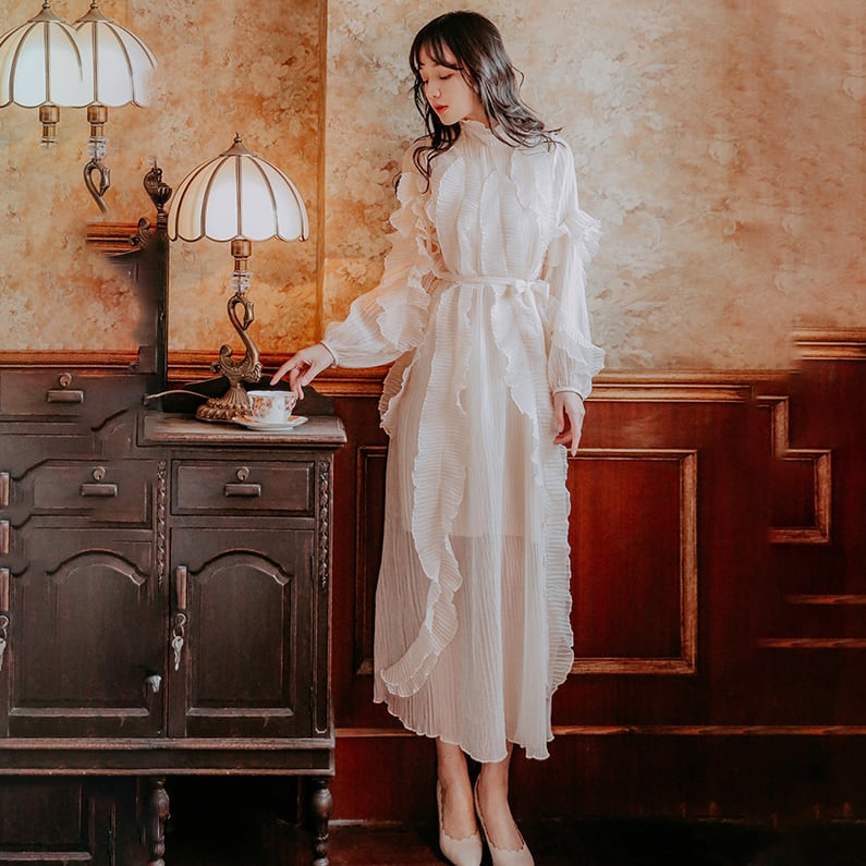 ワンピース ベルト付きフリルフレアワンピース ワンピドレス ロング丈 マキシ丈 長袖 ボリューム袖 パフスリーブ ハイネック セミフレア シフォン フリル ウエストリボン 透け感 シースルー 大人可愛い きれいめ 上品 おしゃれ お洒落 レトロ 大人女子 こなれ感 エレガント 主役級 存在感 無地 春 秋 20代 30代 レディース デート お出かけ 休日 パーティー イベント リゾート 旅行 ホテル レストラン 体系カバー 脚長 インスタ映え S M L オフホワイト