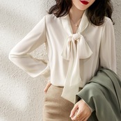 トップス ブラウス 袖あり 長袖 襟付き リボン 薄手 大人可愛い きれいめ シンプル 大人 上品 おしゃれ こなれ感 エレガント とろみ感 無地 春 夏 入学式 入園式 20代 30代 レディース ビジネス OL 通勤 デート 女子会 着回し 普段使い 韓国 モテ S M L XL ホワイト ブラック アプリコット | Raforea
