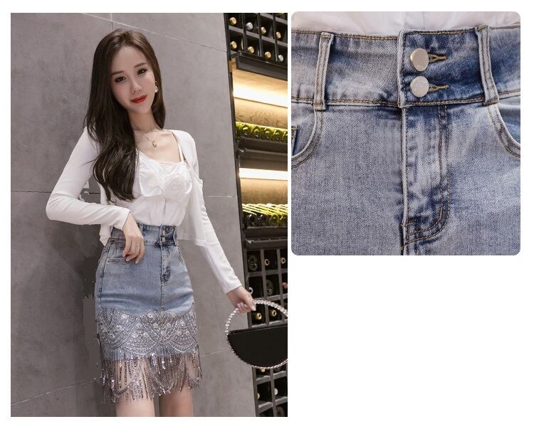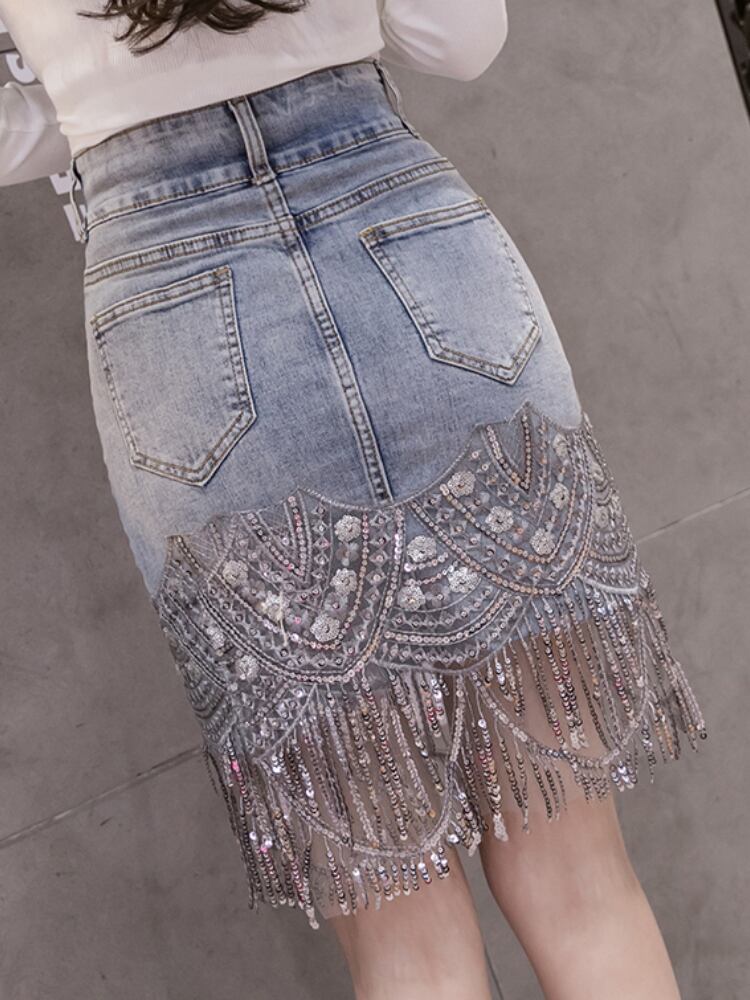 スカート デニムスカート ショート丈 膝上 タイト Iライン スパンコール きれいめ レトロ アジアン こなれ感 ガーリー 無地 春 夏 秋 10代 20代 男の子 お出かけ 女子会 休日 普段使い 楽ちん サイズ S M L XL 2XL 3XL 色展開 ライトブルー | Raforea