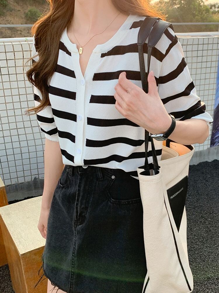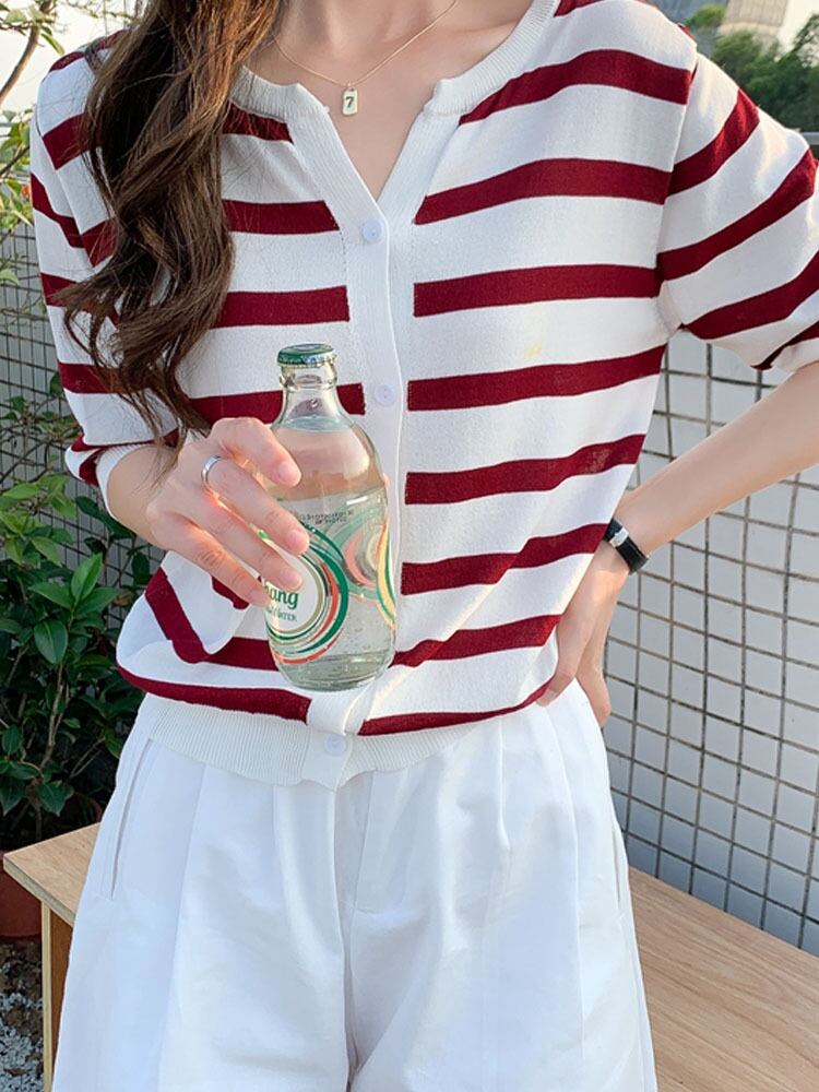 トップス カーディガン 袖あり 半袖 5分袖 ボリューム袖 ラウンドネック 襟なし 前開き 伸縮性 サマーニット かわいい 大人可愛い きれいめ シンプル カジュアル 大人 上品 おしゃれ 大人可愛い 大人女子 こなれ感 ラフ エレガント とろみ感 抜け感 ボーダー ストライプ 春 夏 ビジネス OL 通勤 学生 通学 デート お出かけ 公園デビュー 女子会 休日 リゾート 旅行 重ね着 フリーサイズ 黒 ブラック 赤 レッド ネイビー | Raforea