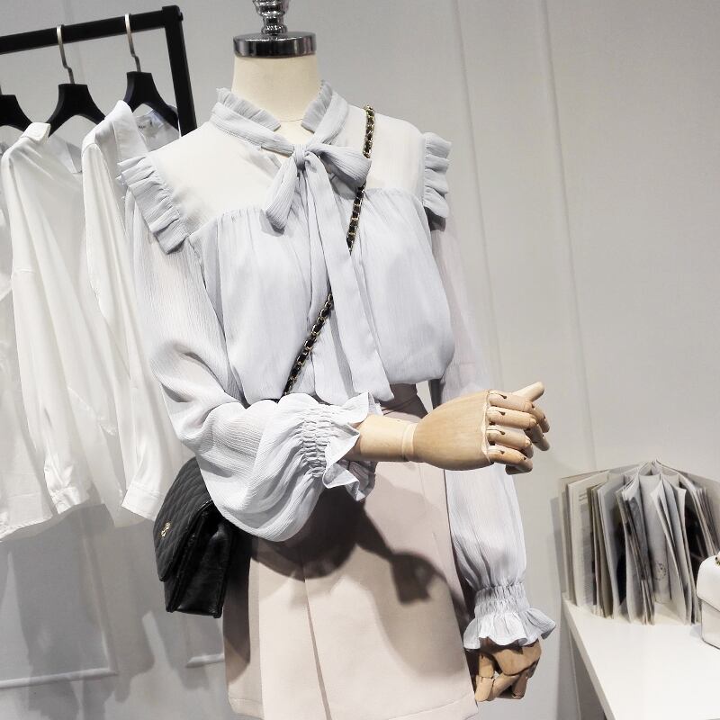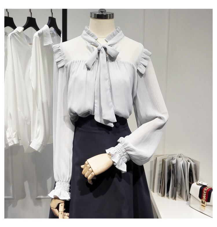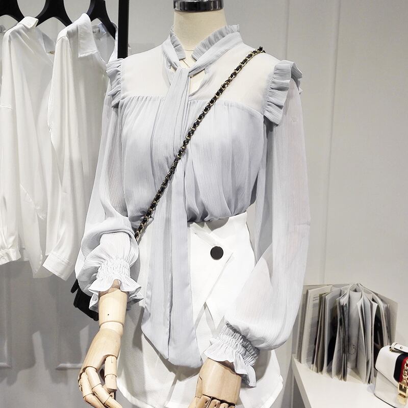 トップス シャツ ブラウス 袖あり 長袖 シフォン フリル リボン 透け感 かわいい 大人可愛い 大人 上品 おしゃれ お洒落 大人可愛い 大人女子 こなれ感 ラブリー エレガント とろみ感 無地 春 秋 10代 20代 30代 レディース 女性用 OL 学生 デート お出かけ 着回し 韓国 韓国系 ファッション コーデ スタイル モテ インスタ映え M L ライトブルー | Raforea