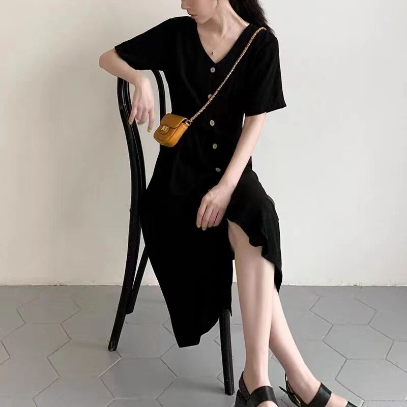 ワンピース ロングスカート フレアワンピース 膝下 ロング丈 半袖 Vネック セミフレア ストレート ワイド ウエストマーク 前開き 薄手 かわいい シンプル カジュアル おしゃれ レトロ ラフ ガーリー 個性的 無地 春 夏 10代 20代 30代 レディース 学生 お出かけ 公園デビュー 女子会 休日 旅行 普段使い 韓国 楽ちん 体系カバー M L XL 2XL 3XL 4XL 黒 ブラック 赤 レッド | Raforea