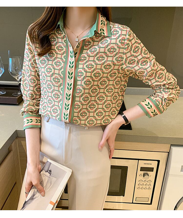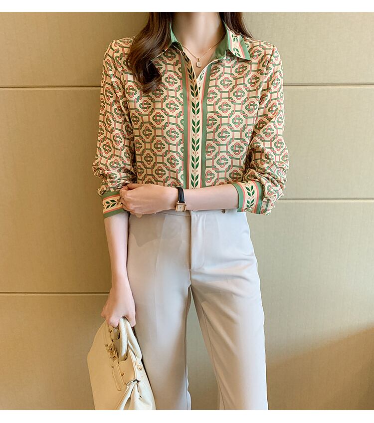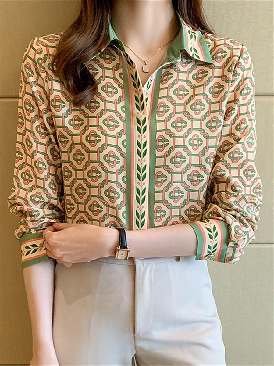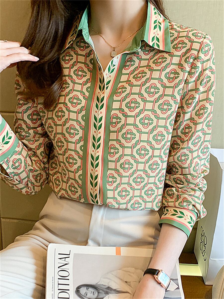 トップス シャツ ブラウス 袖あり 長袖 Vネック 襟付き ストレート シフォン 前開き きれいめ シンプル カジュアル 大人 上品 おしゃれ かっこいい レトロ 大人可愛い 大人女子 こなれ感 個性的 モード系 エレガント モダン 柄 プリント 春 秋 レディース ビジネス OL 通勤 学生 通学 デート 女子会 S M L XL 2XL 緑 グリーン ベージュ カーキ 大人カラー | Raforea