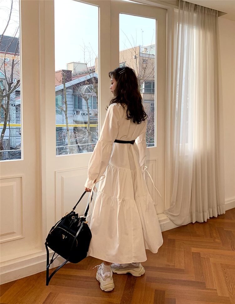 ワンピース カットソー 白トップス フレアワンピース ミモレ丈 8分丈 袖あり 長袖 ボリューム袖 Vネック 襟付き フレア Aライン ウエストマーク かわいい アジアン ラフ 存在感 抜け感 無地 春 秋 10代 20代 学生 デート お出かけ パーティー 普段使い 定番 サイズ ワンサイズ 色展開 ホワイト