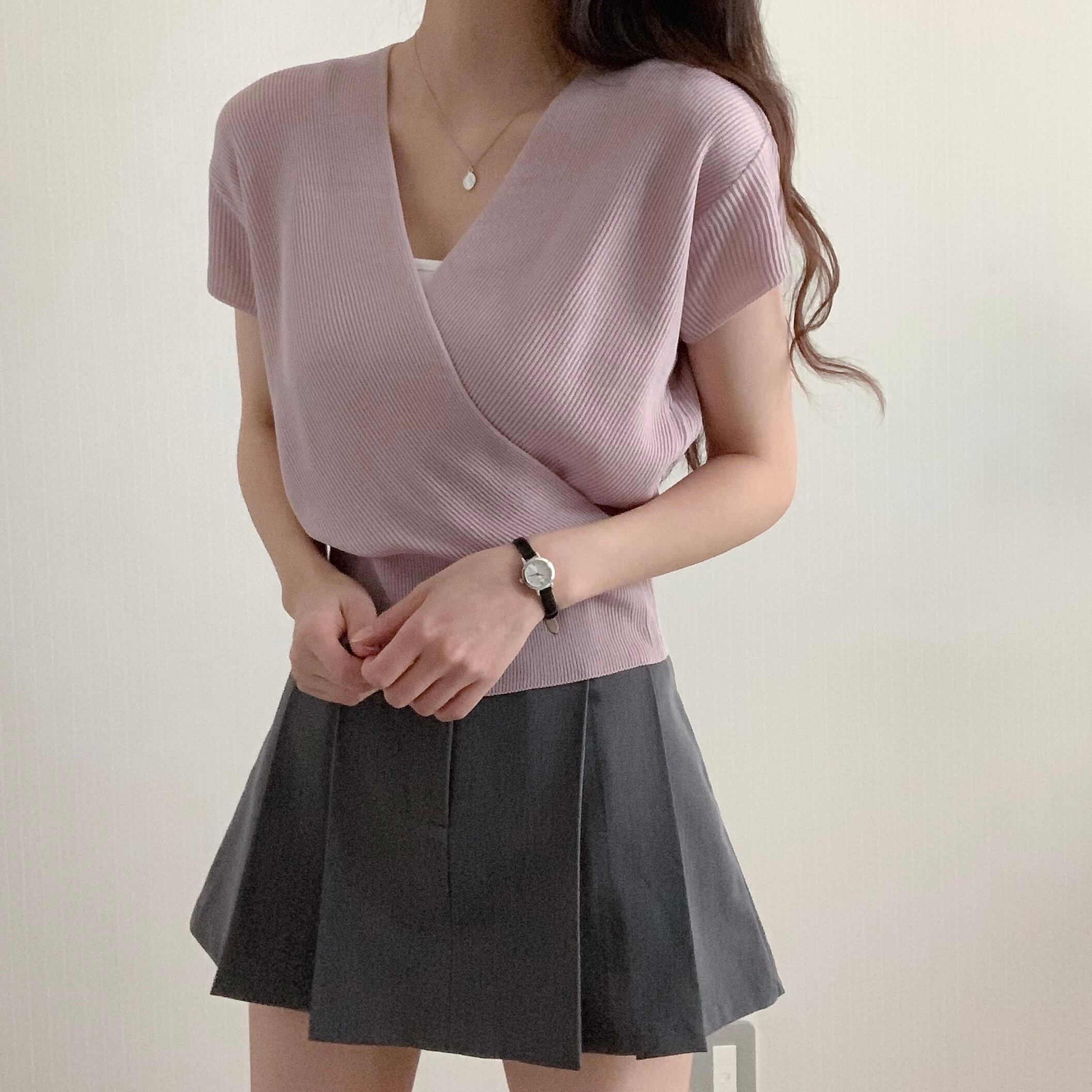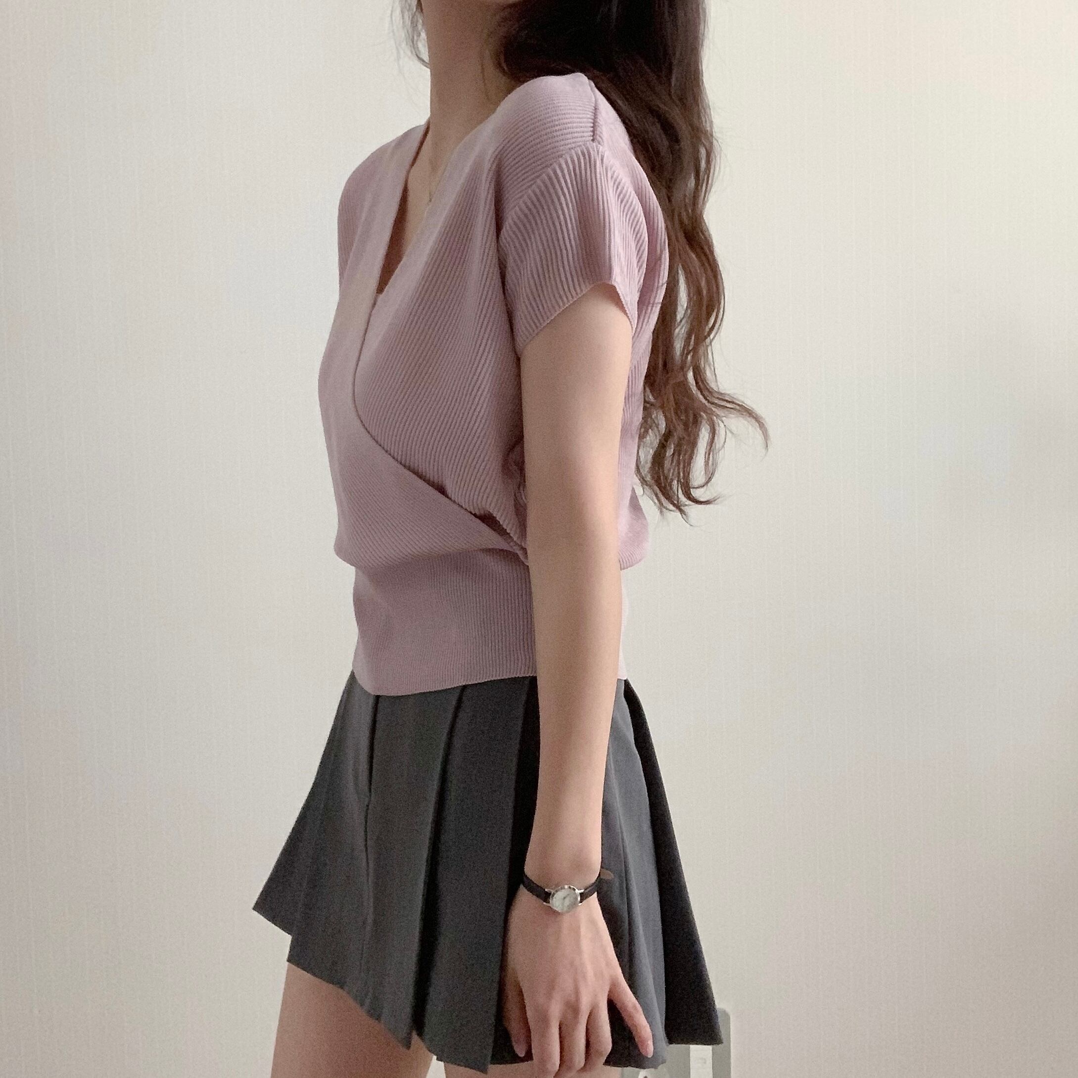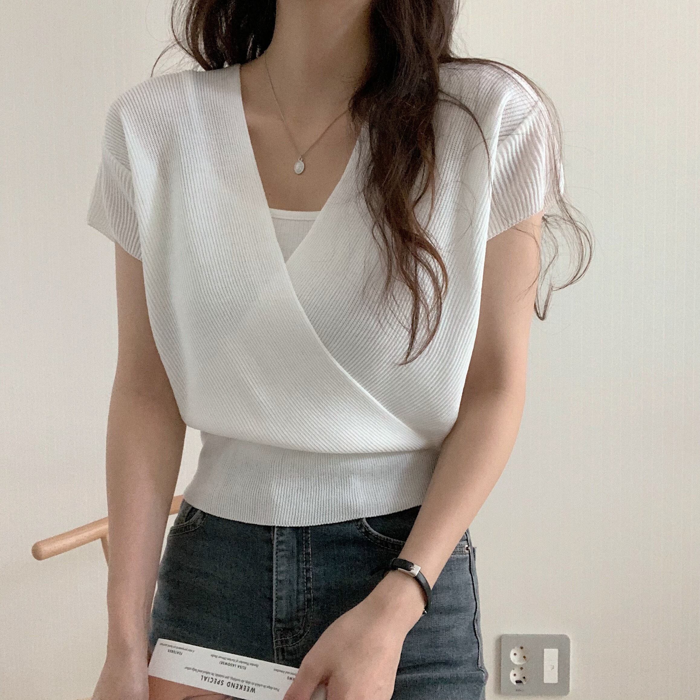 トップス ニットソー セーター クロップド 袖あり 半袖 Vネック 襟なし スリム ストレート 薄手 カジュアル 大人 アジアン エキゾチック 大人女子 クール フォーマル 無地 春 夏 秋 30代 40代 50代 女子会 お泊まり 休日 旅行 普段使い 安い サイズ ワンサイズ 色展開 白 黒 緑 黄色 ピンク | Raforea