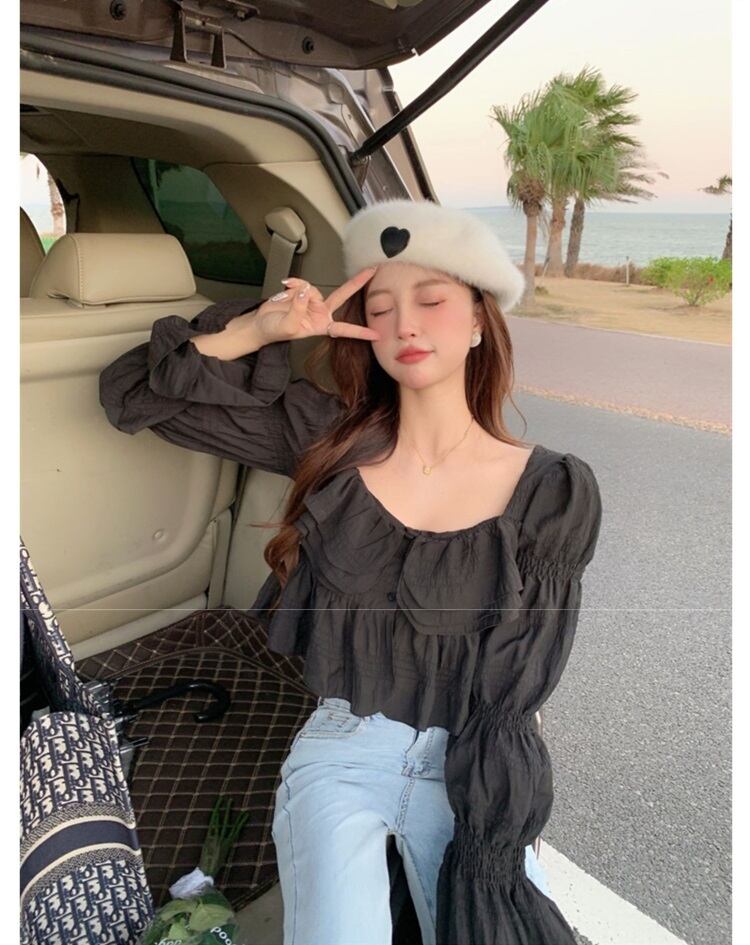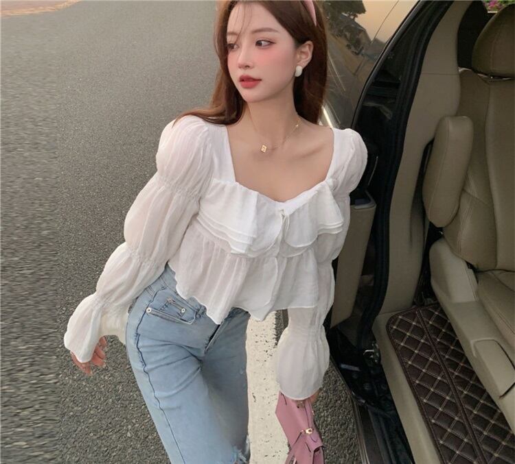トップス カットソー 白トップス 袖あり 長袖 パフスリーブ スクエアネック スリム 薄手 かわいい カジュアル アジアン ラフ ラブリー ガーリー 存在感 無地 春 夏 10代 20代 学生 通学 デート お出かけ お泊まり 休日 普段使い サイズ S M L 色展開 白 黒 | Raforea