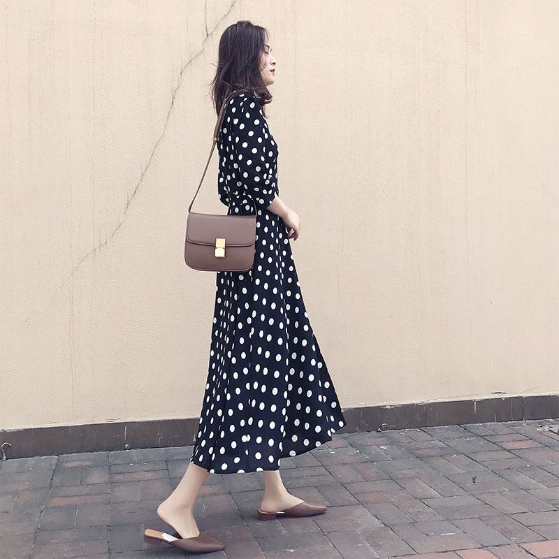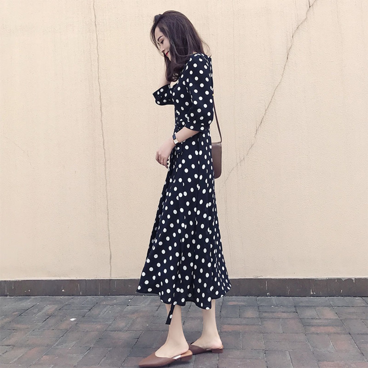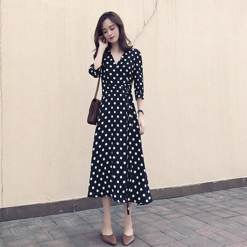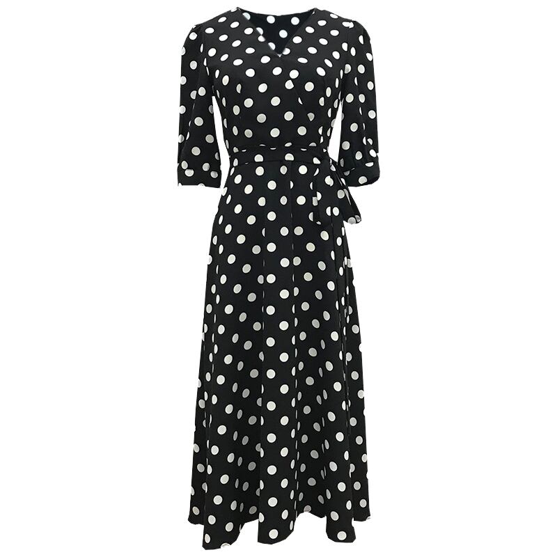 ワンピース フレアワンピース ワンピドレス 膝下 ロング丈 袖あり 7分袖 七分袖 Vネック 襟なし Aライン リボン ウエストマーク ウエストリボン ハイウエスト かわいい 大人可愛い きれいめ 大人 上品 おしゃれ レトロ エキゾチック 大人可愛い 大人女子 こなれ感 ラブリー キュート ガーリー 個性的 エレガント 主役級 存在感 とろみ感 抜け感 ドット柄 水玉 春 夏 秋 レディース ビジネス OL 通勤 学生 通学 デート 女子会 モテ S M L XL 2XL ブラック 黒 | Raforea