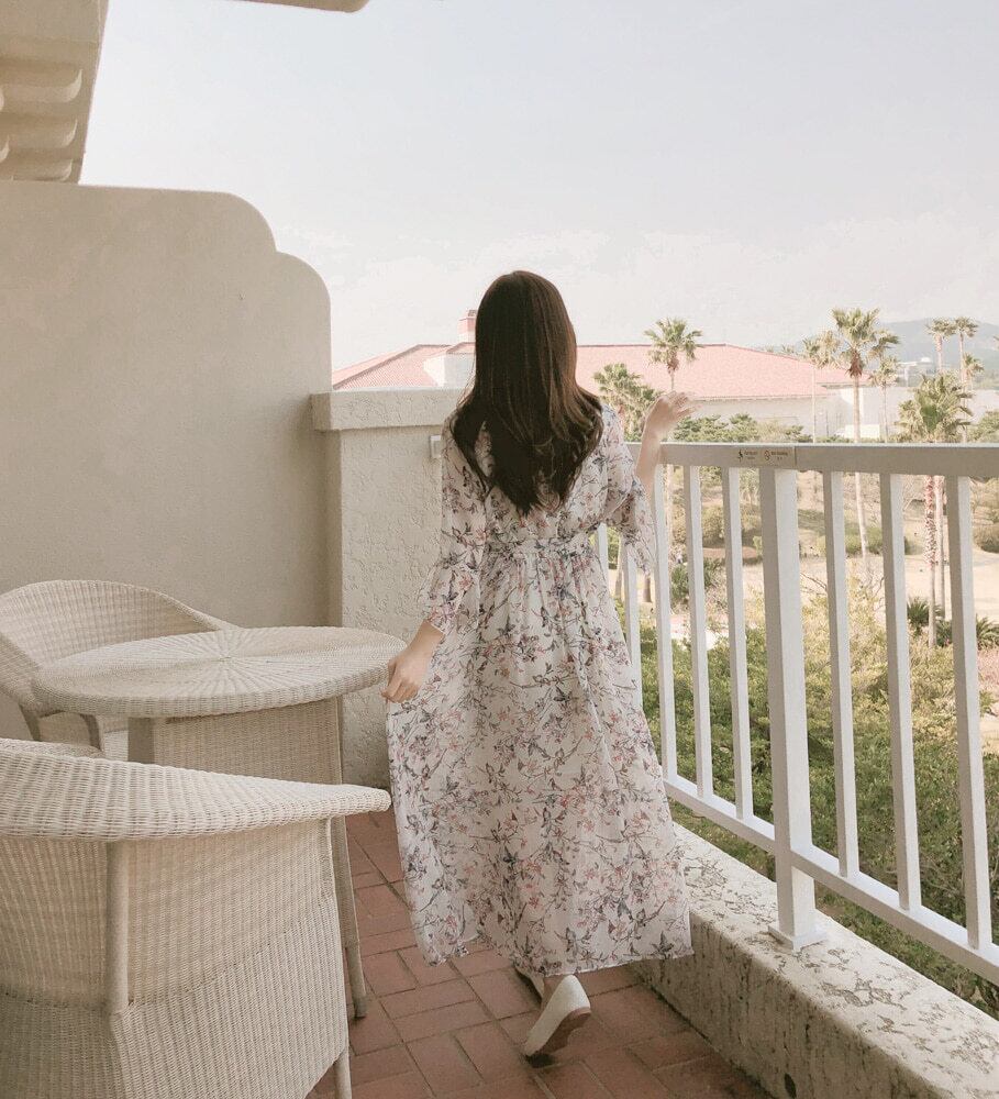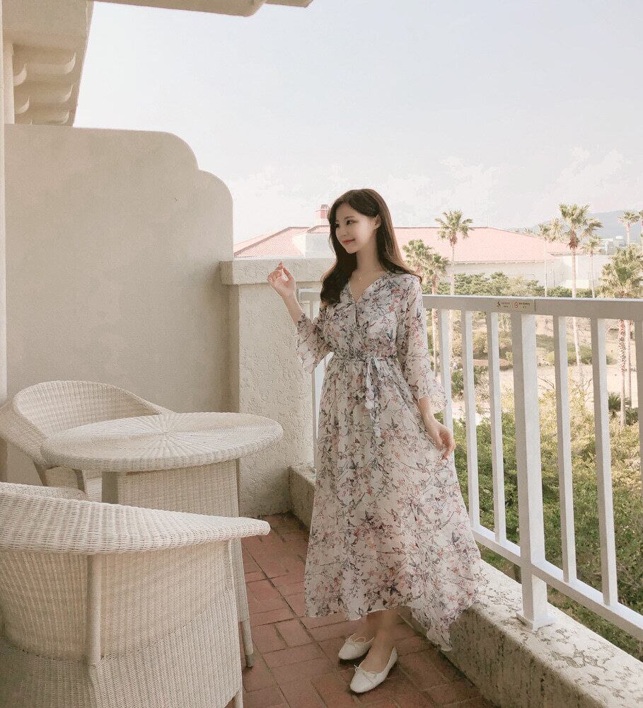 ワンピース フレアワンピース ワンピドレス 膝下 ロング丈 袖あり 7分袖 七分袖 ボリューム袖 ホルンスリーブ Vネック 襟なし フレア Aライン シフォン リボン ウエストマーク ウエストリボン ハイウエスト 透け感 シースルー かわいい 大人可愛い きれいめ 上品 おしゃれ レトロ アジアン エスニック エキゾチック 大人可愛い 大人女子 こなれ感 ラブリー キュート ガーリー エレガント とろみ感 抜け感 花柄 フラワー 春 夏 レディース デート 女子会 S M L XL ホワイト ブルー | Raforea