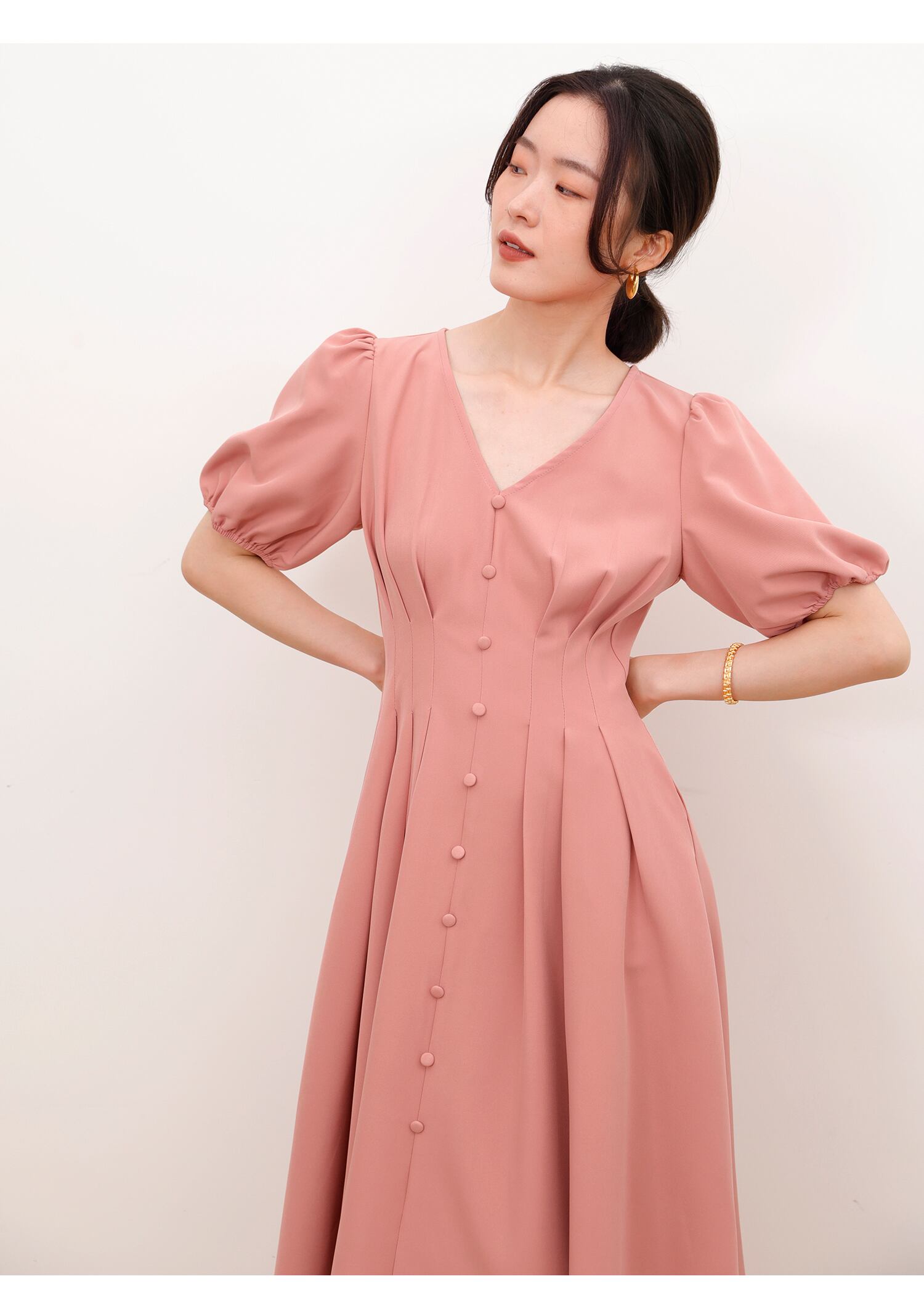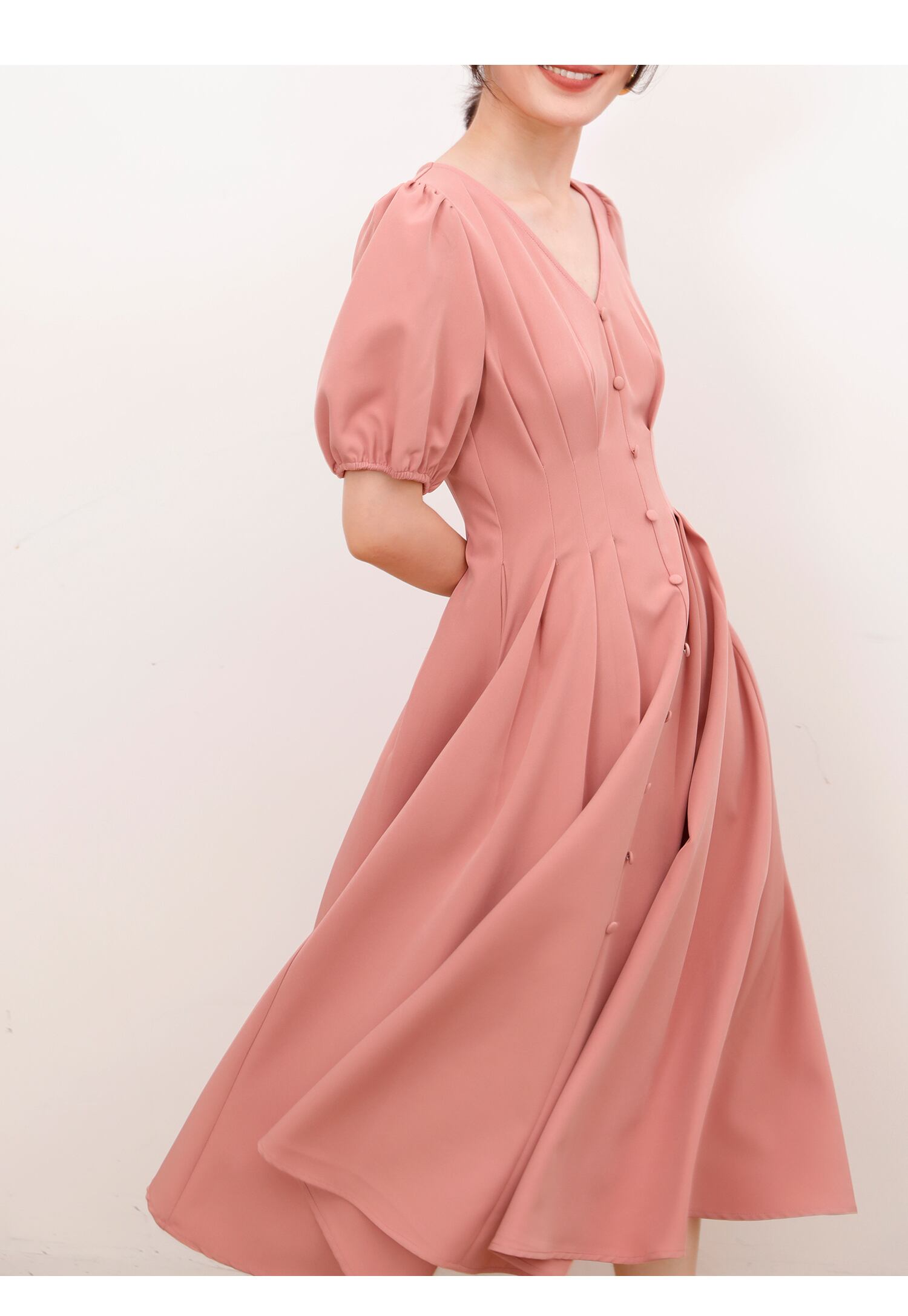 ワンピース フレアワンピース ワンピドレス 膝下 ロング丈 袖あり 半袖 5分袖 ボリューム袖 パフスリーブ Vネック 襟なし フレア Aライン ウエストマーク ハイウエスト かわいい 大人可愛い きれいめ 大人 上品 おしゃれ レトロ 大人可愛い 大人女子 こなれ感 ラブリー キュート ガーリー エレガント モダン 主役級 存在感 無地 夏 レディース ビジネス OL 通勤 学生 通学 デート 女子会 お泊まり ホテル レストラン モテ S M L ピンク | Raforea