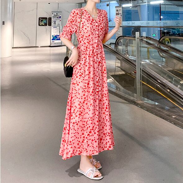 ワンピース フレアワンピース 膝下 マキシ マキシ丈 半袖 ボリューム袖 Vネック フレア ハイウエスト 前開き ウエストゴム 大人可愛い きれいめ 上品 おしゃれ お洒落 大人女子 こなれ感 エレガント 柄 花柄 リーフ柄 夏 20代 30代 デート お出かけ 女子会 お泊まり 休日 リゾート 旅行 レストラン 着回し 普段使い 楽ちん 体系カバー 脚長 S M L XL 2XL 赤 レッド | Raforea