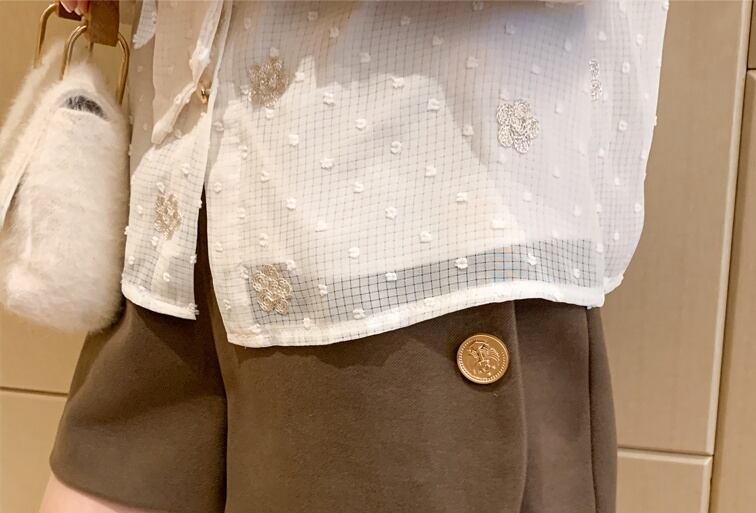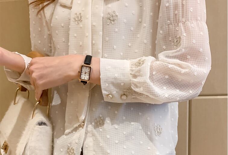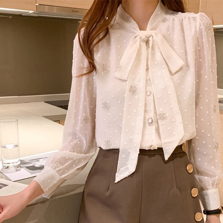 ドット柄と花柄の立体デザインがお洒落なボウタイ付きシースルーシフォンブラウス。