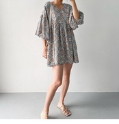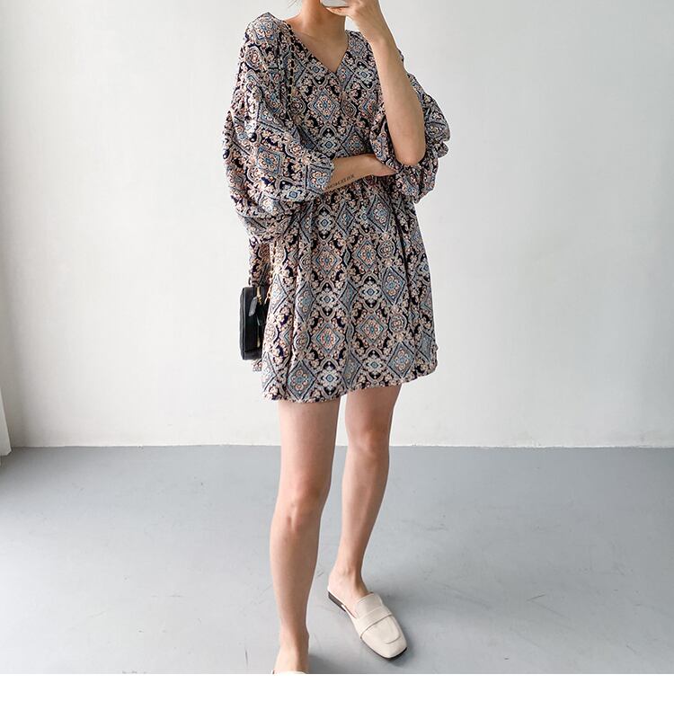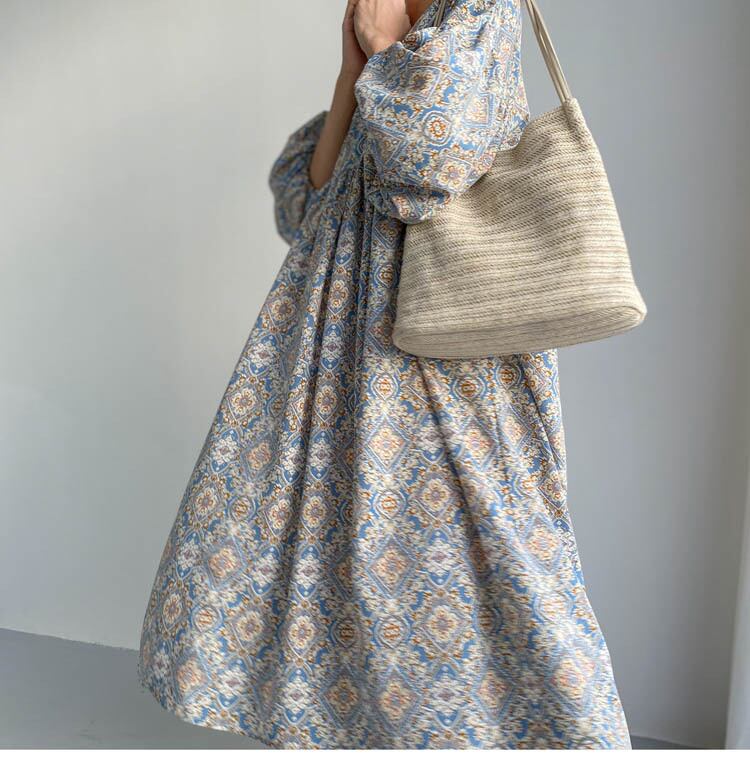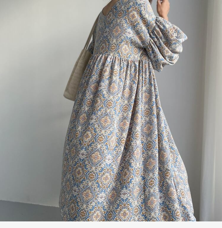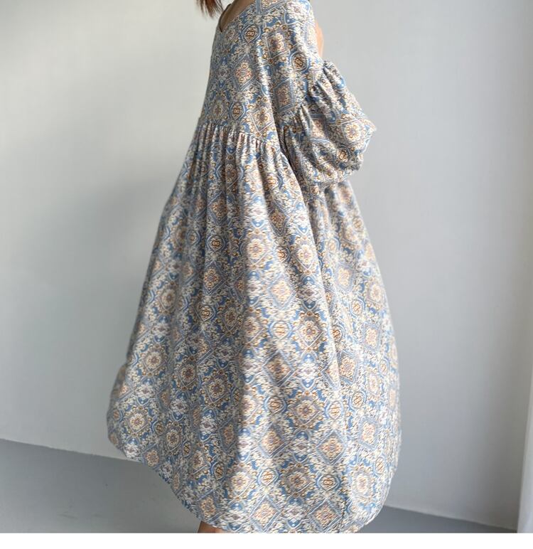 ワンピース オールインワン ロジスワンピース 膝上 マキシ丈 袖あり 半袖 ボリューム袖 ランタンスリーブ Vネック 襟なし Aライン コットン カジュアル 大人 レトロ エスニック 大人女子 こなれ感 ラフ 個性的 小花柄 春 夏 秋 30代 40代 50代 マタニティ お出かけ 公園デビュー 女子会 休日 楽ちん 涼しい サイズ ワンサイズ 色展開 ライトブルー ダークブルー | Raforea